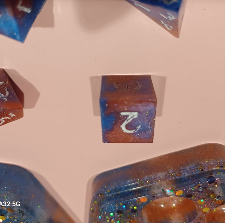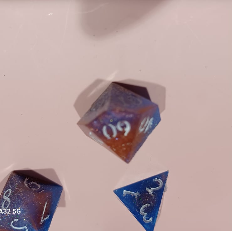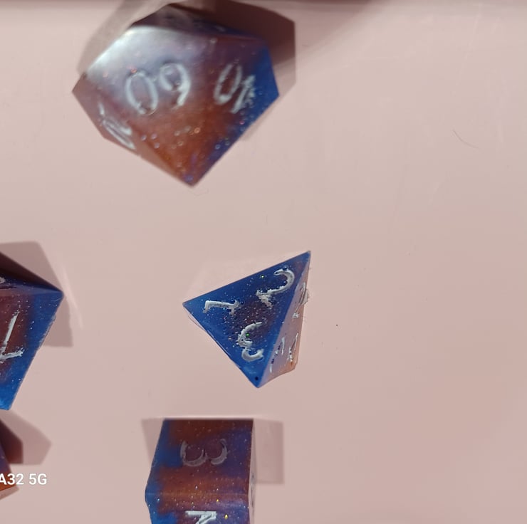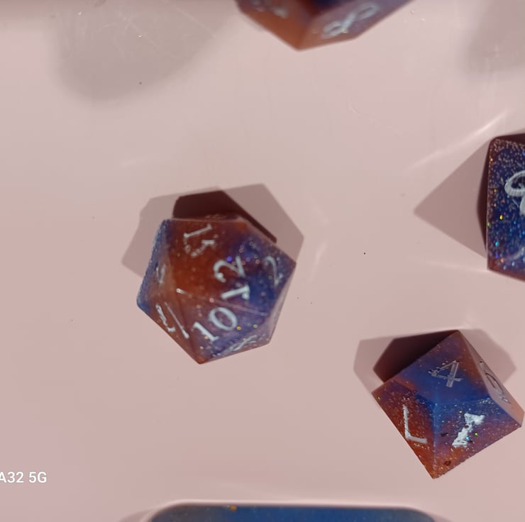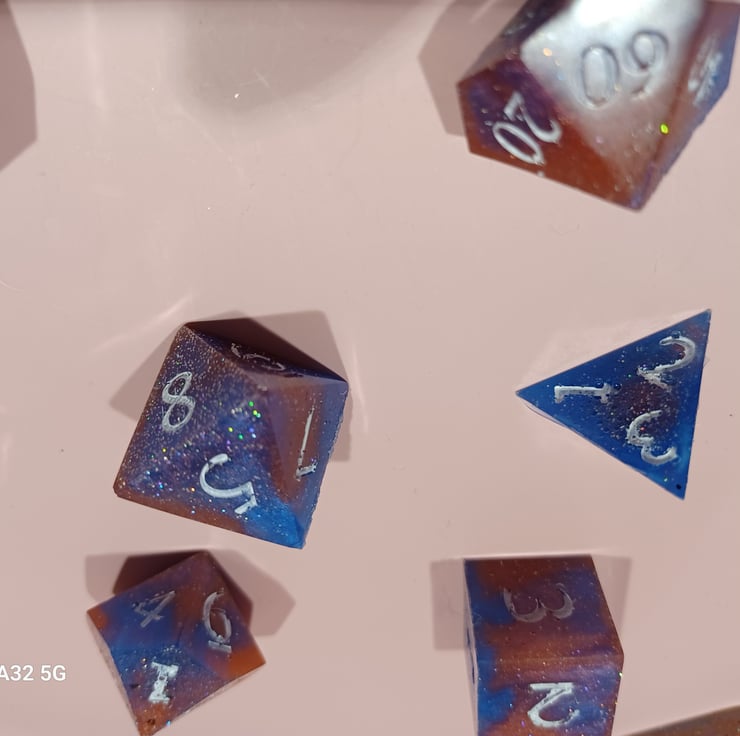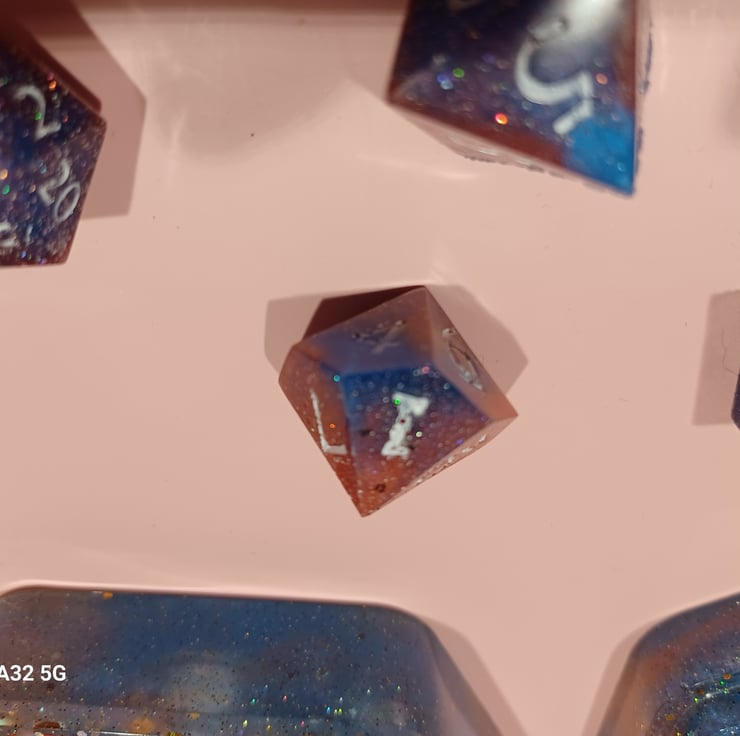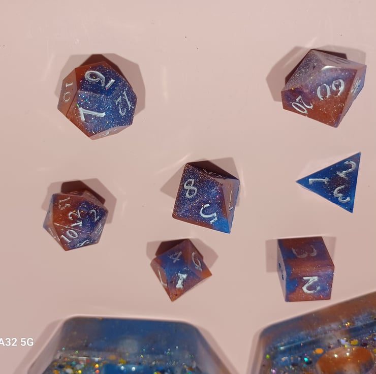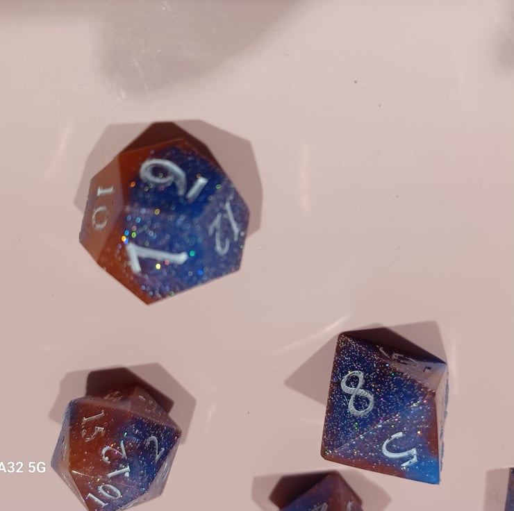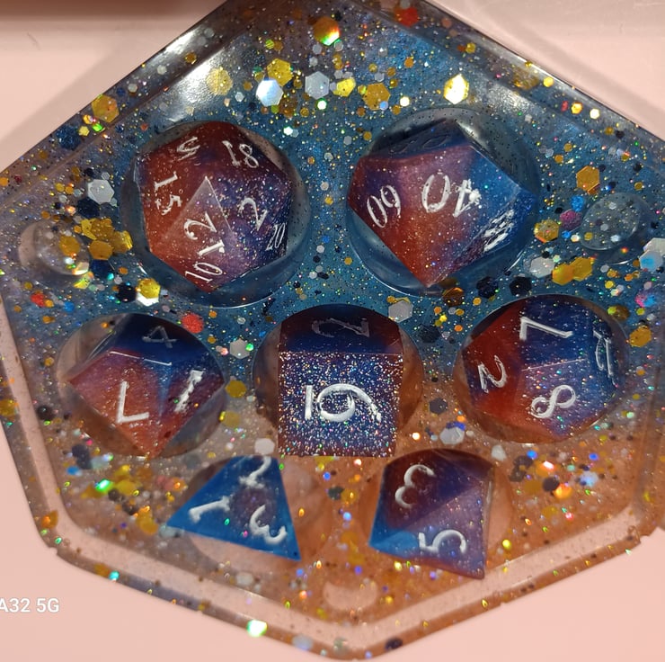 A set of 7 different resin dice in a specially made matching box. This set is in red and blue with chunky glitter and white painted numbers. The dice set is ideal for any role playing fans or dungeons and dragons gamers. This set comes in three different colourways or can be custom ordered in any colours of your choice.