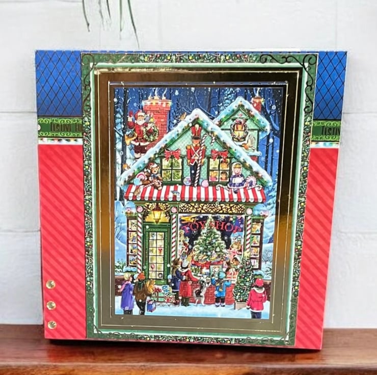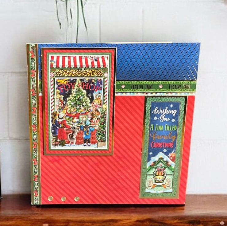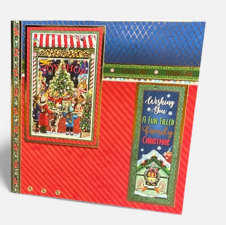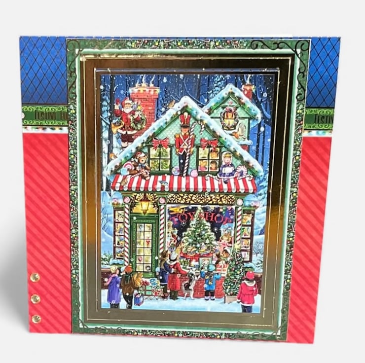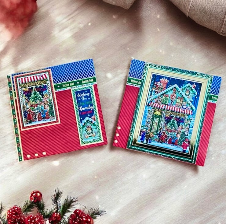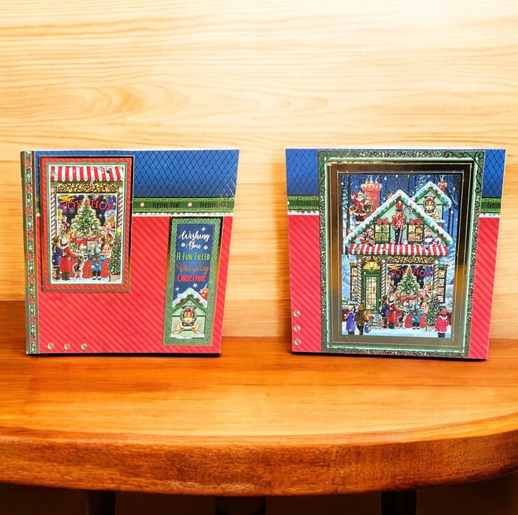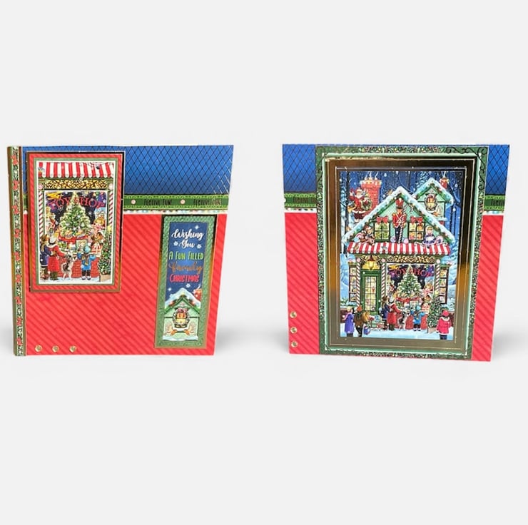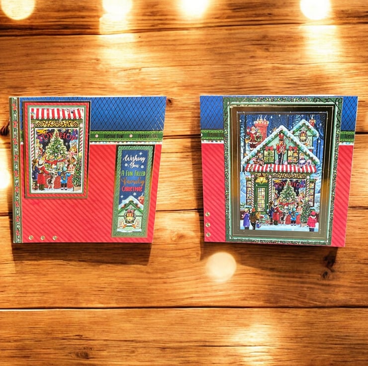 Share the magic of the season with this charming set of two handcrafted Christmas cards. Each card features a beautifully detailed festive toy shop scene, highlighted with rich reds, golds, and coordinating blue accents. The layered design adds depth and warmth, making these cards a delightful keepsake for anyone who receives them.