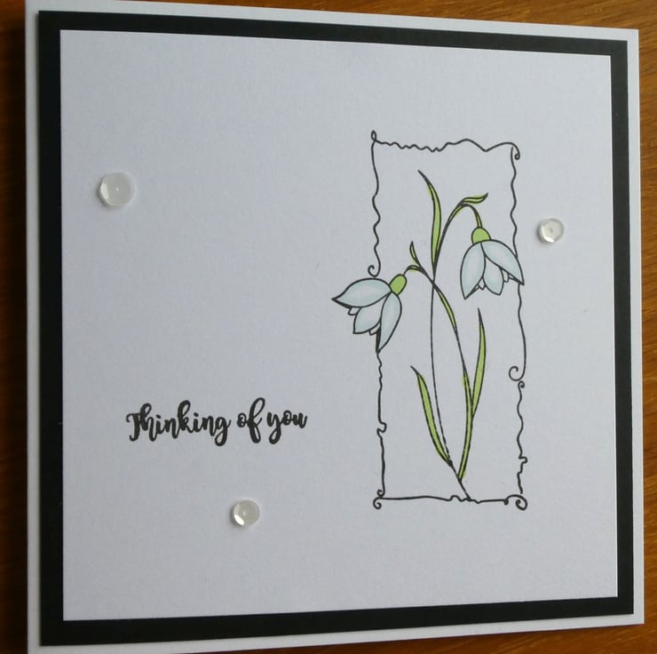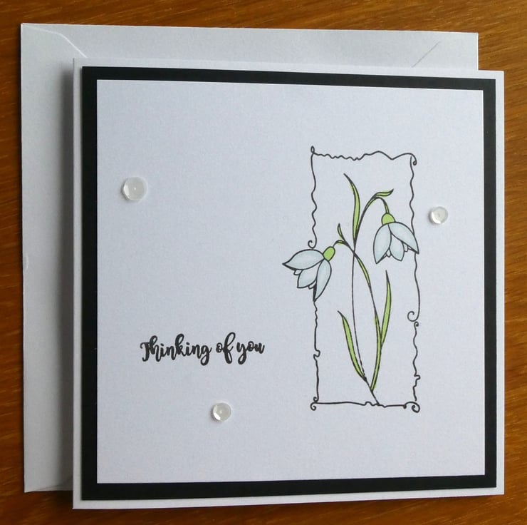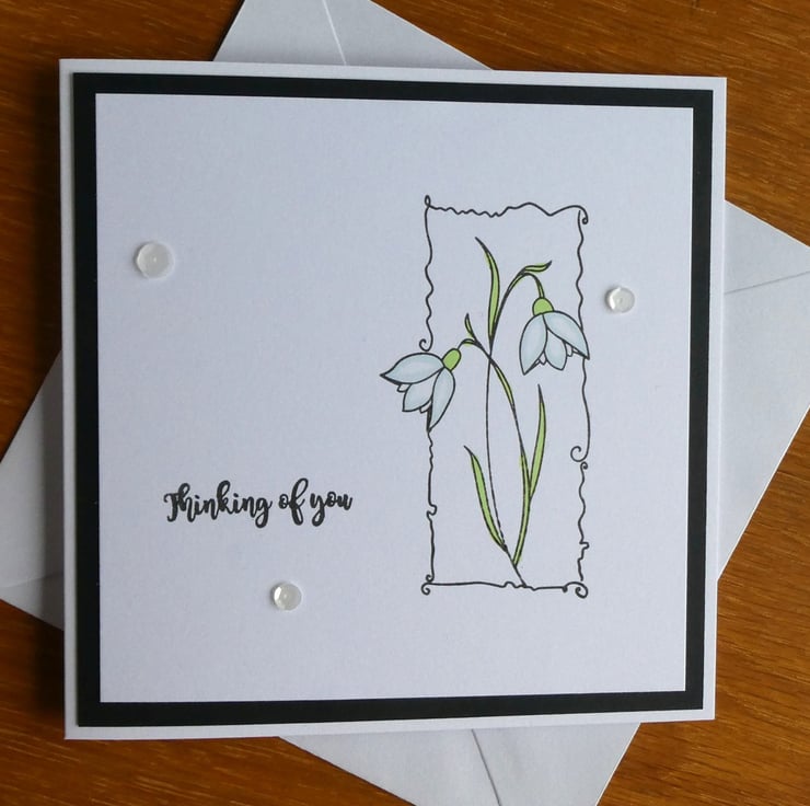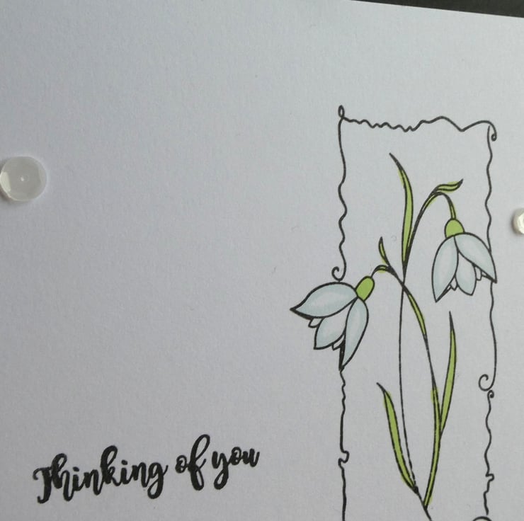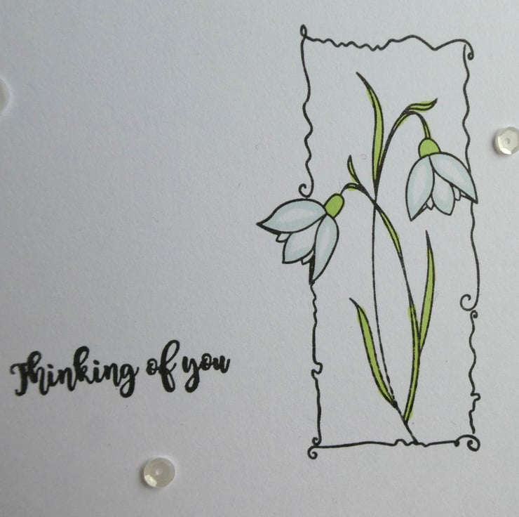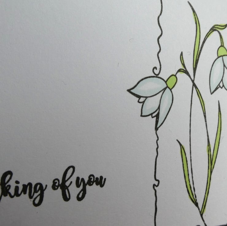 This simple Thinking of you card features a hand stamped and coloured image of snowdrops in subtle shades of green, ice blue and white. Ideal to send as a Get Well or Sympathy card or to just let someone know that you are thinking of them.