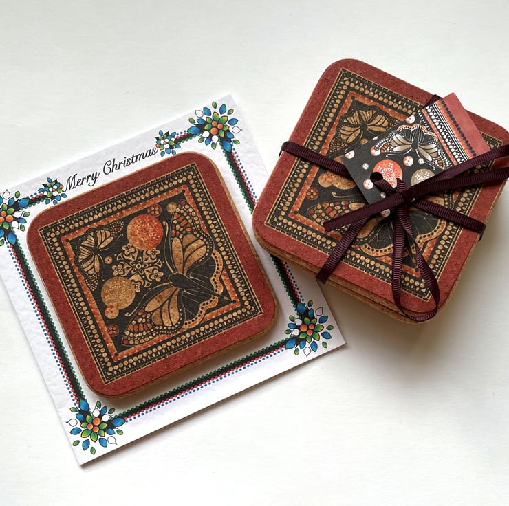 If you need a small Christmas gift, whether for a friend or a Secret Santa, then this Christmas card and coaster combined is ideal! This Art-Deco influenced Red and Black Butterfly design with amazing detail and an intricate geometic border is digitally printed on quality cork and mounted on a card with a decorative printed frame. So why not choose this designer eco-friendly gift ,which is useful in either the office or around the home.