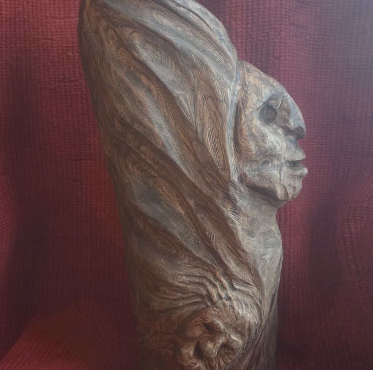 This unique piece of folk art stands at 42 cm and is hand-carved from naturally fallen wood collected during an autumn woodland walk. The natural shapes of the grain inspired the two faces that appear in the sculpture, giving it a distinctive character and presence.
