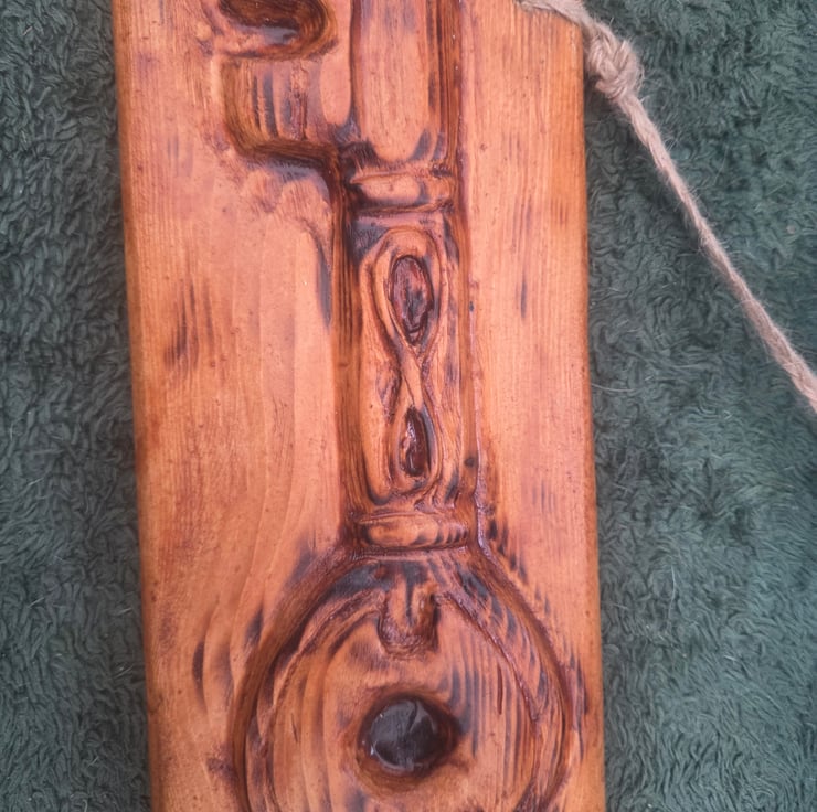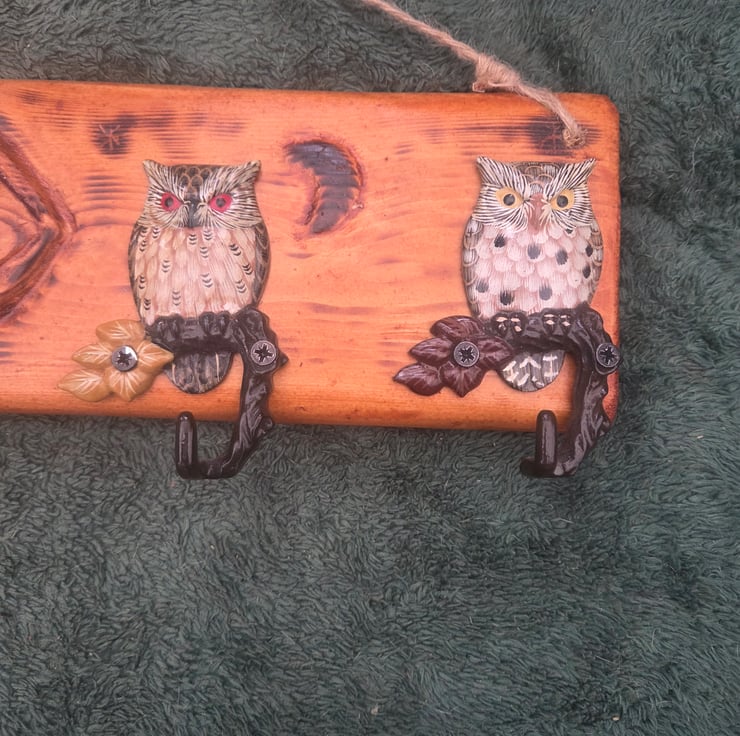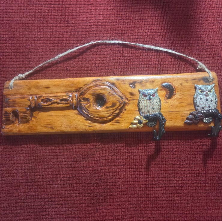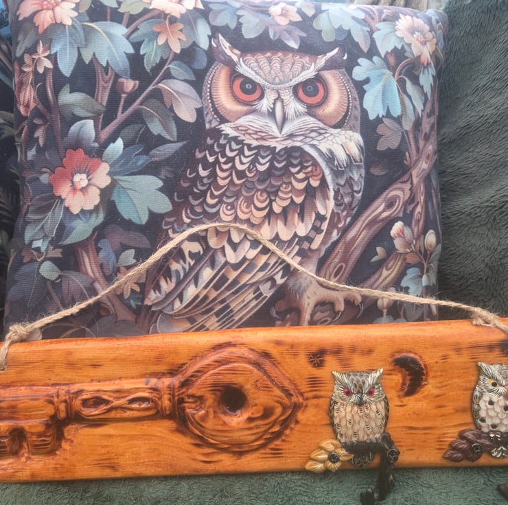 “I’ve always enjoyed giving old materials a new purpose, and this piece began with a leftover length of skirting board from a home project. Instead of throwing it away, I saw potential in the shape and grain of the wood. I decided to turn it into something useful and decorative, combining carving, burning and owl accents to create a practical piece of woodland-themed wall art.”