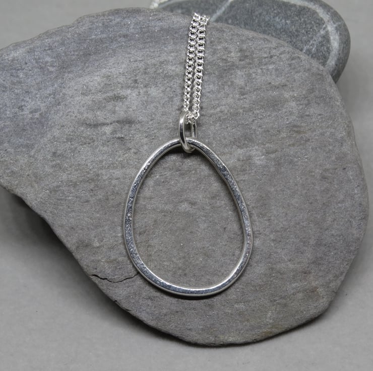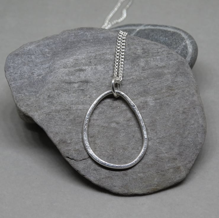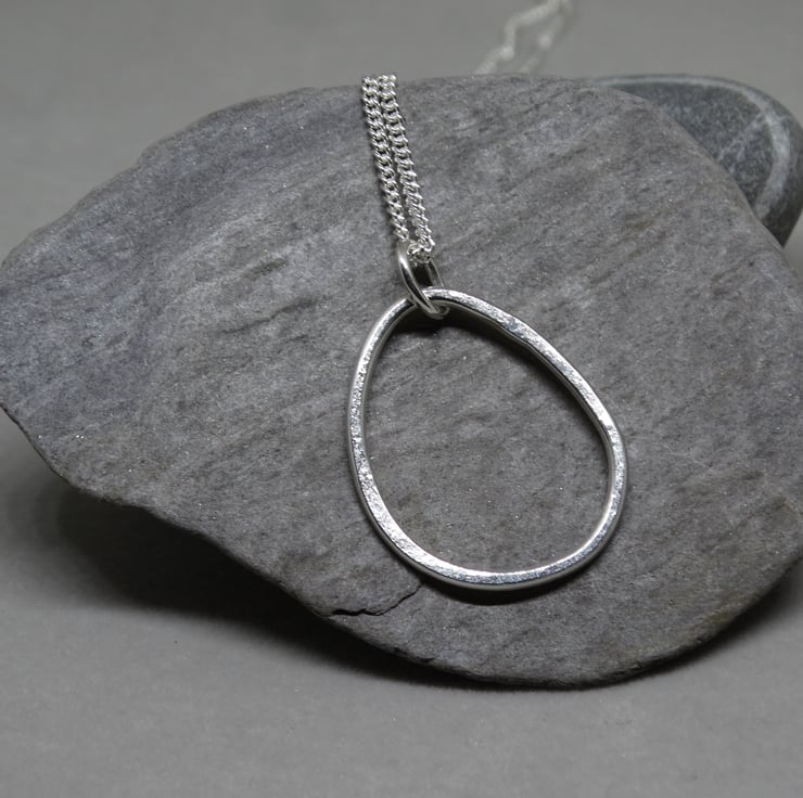 This stylish, contemporary pendant is crafted by hand from recycled sterling silver. The pebble-shaped hoop has been lightly hammered to give it a subtle texture and matt finish.