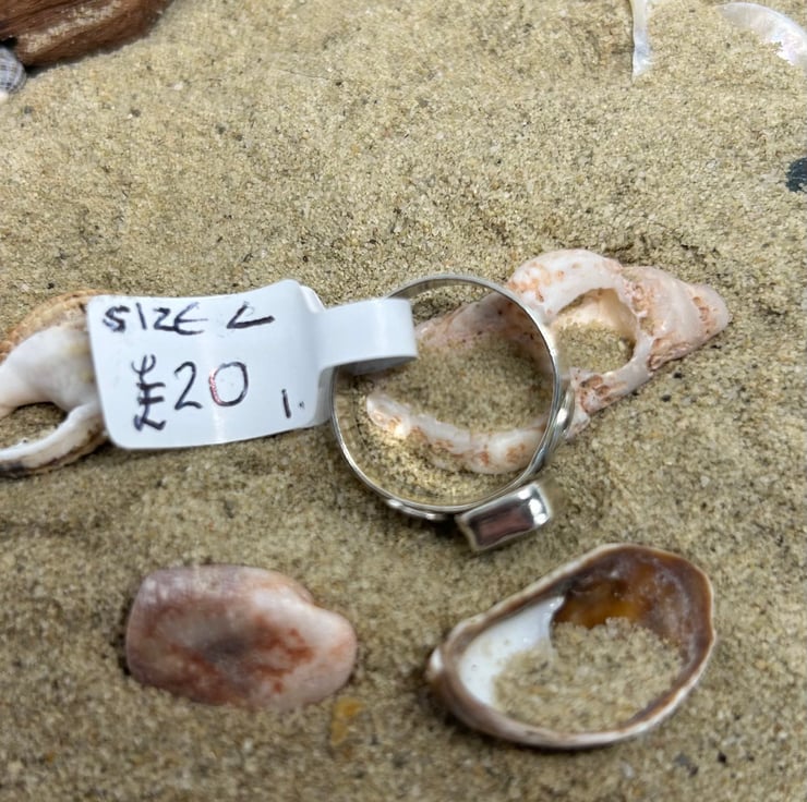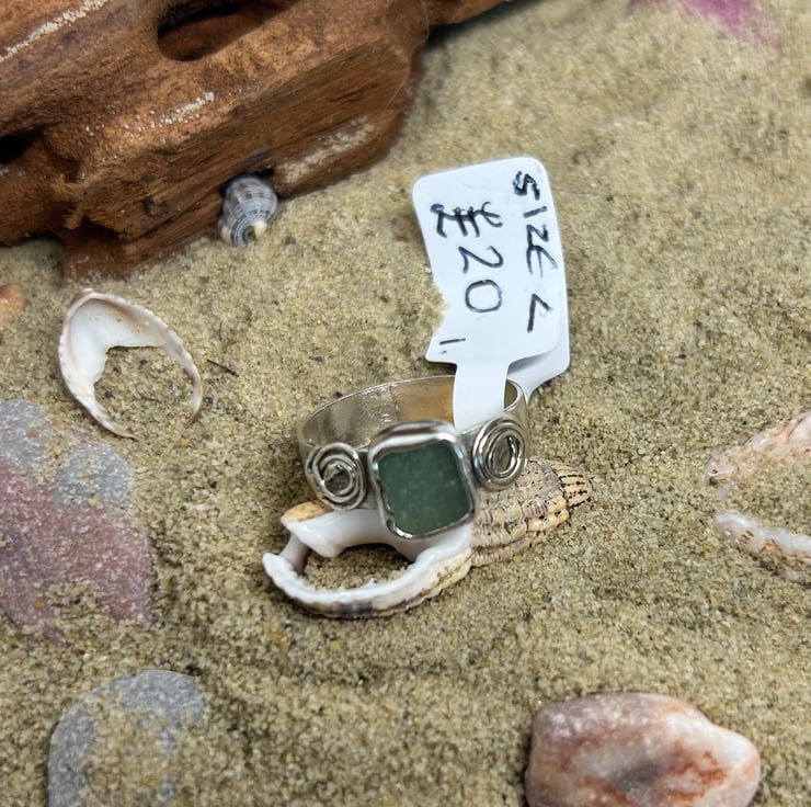 This beautiful ring is size L. It is handmade from sterling silver and set with green sea glass.
