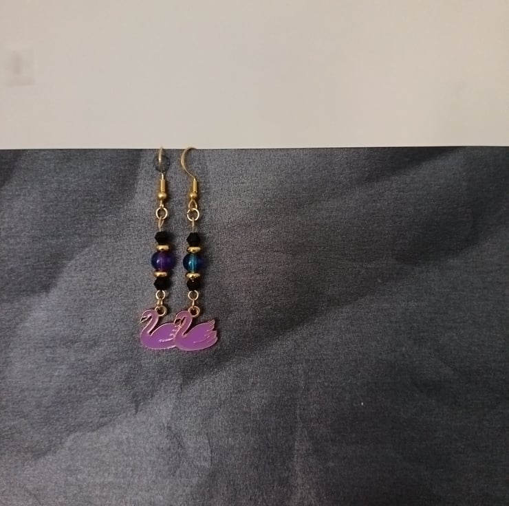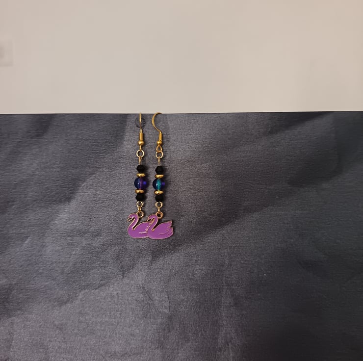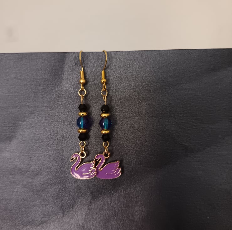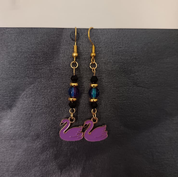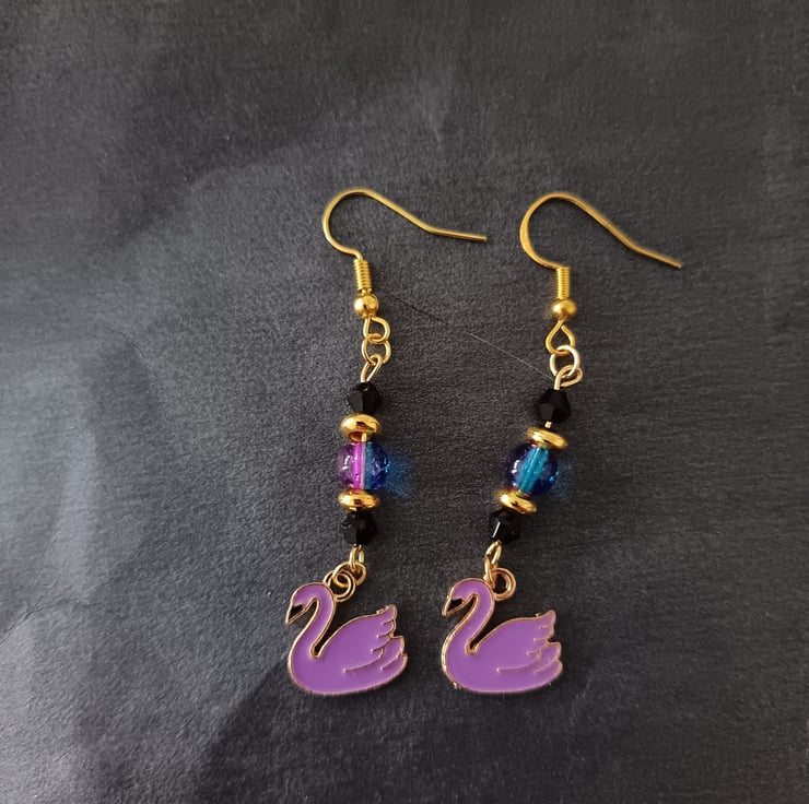 These handmade earrings are crafted with gold coloured stainless steel hooks and jump rings, purple and gold enamel swan charms with black beak detail, gold decorative spacers and beads in black and blue-purple.