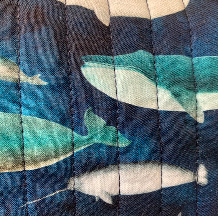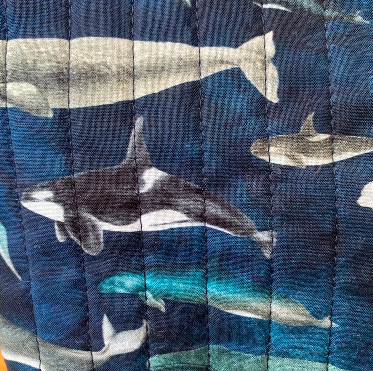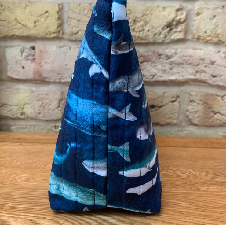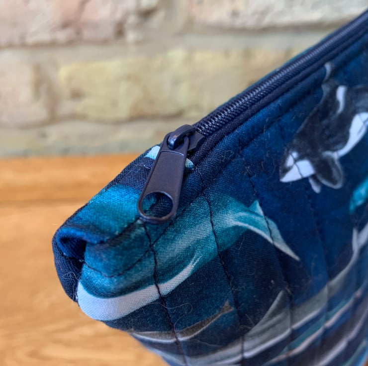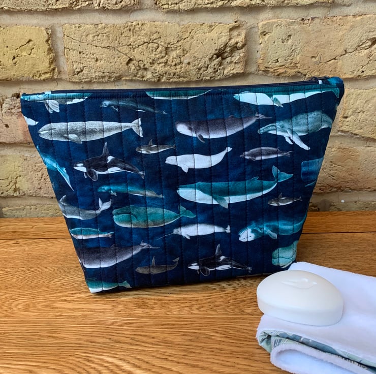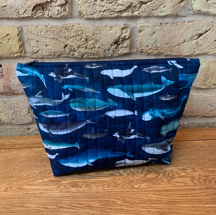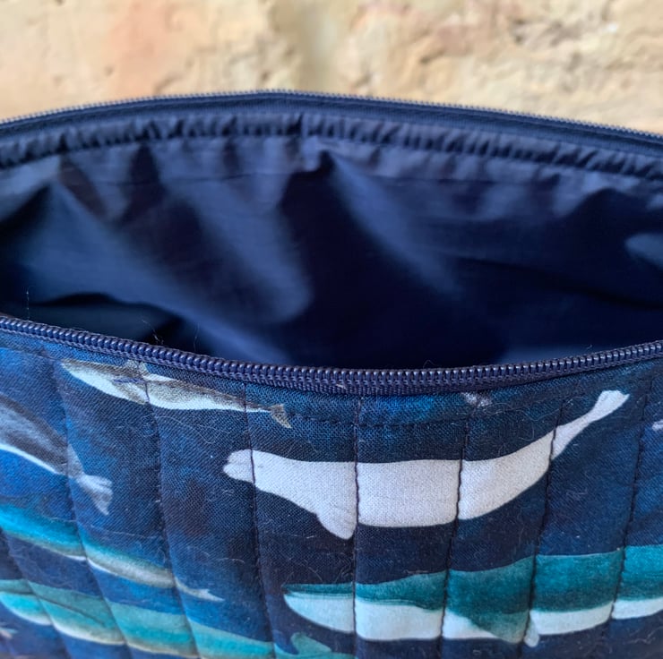 The quilted wash bag is made in this gorgeous whale print fabric on a dark blue background. The bag can be used as either a wash bag or a makeup bag.