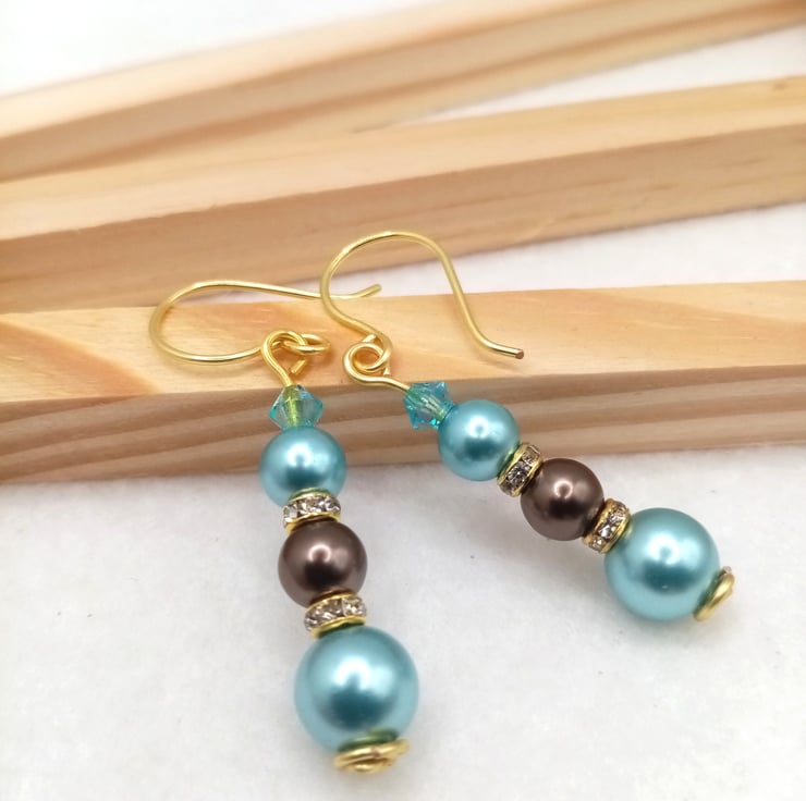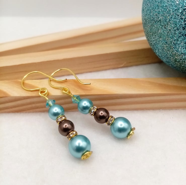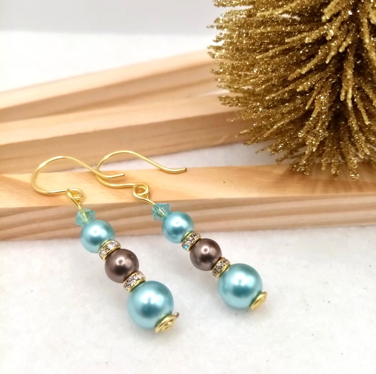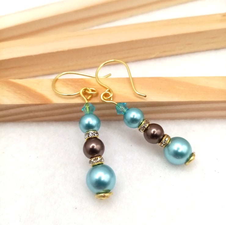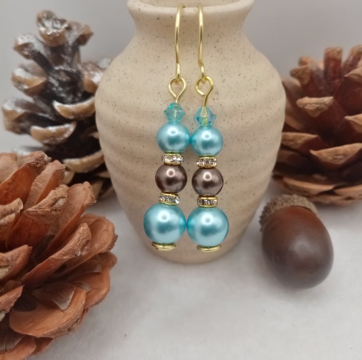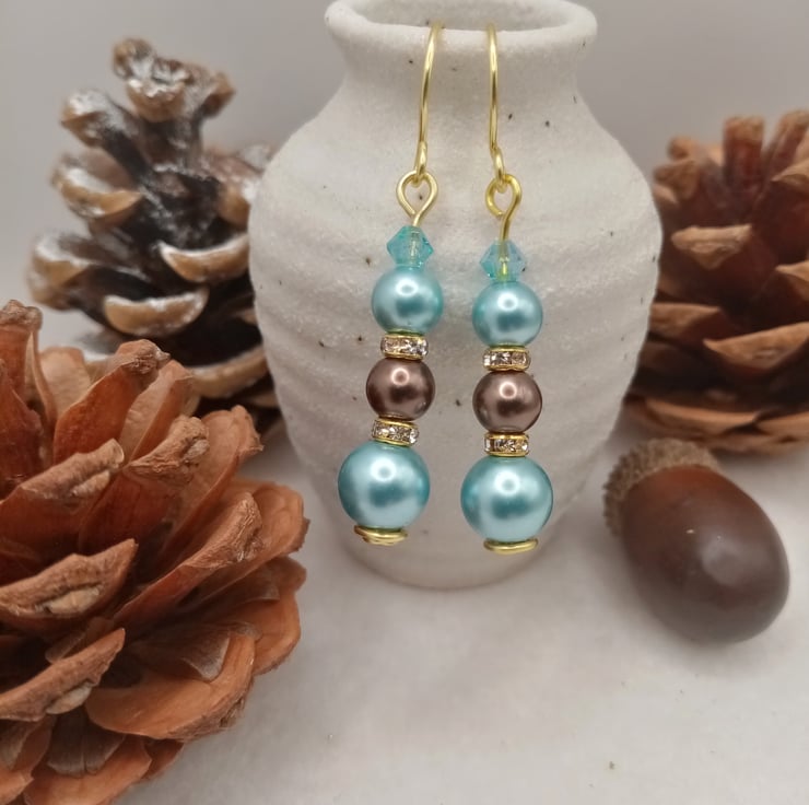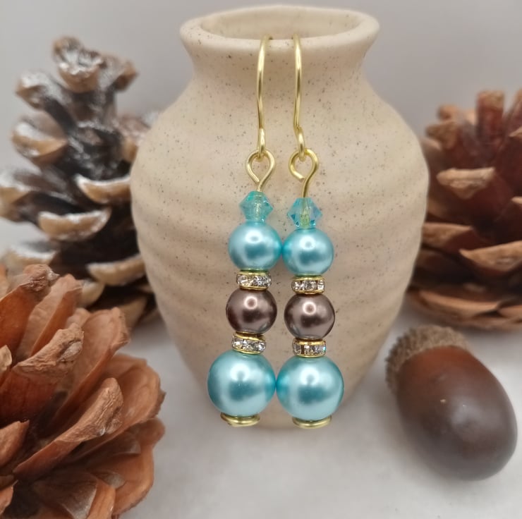 These ice blue and nut brown glass pearl bead drop earrings are handmade using one 8mm ice blue glass pearl, two 6mm glass pearl beads in ice blue and nut brown with two 4mm gold coloured diamanté spacer rondelles topped off with a 4mm light blue crystal glass bicone bead.