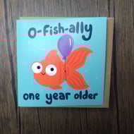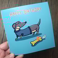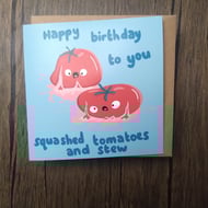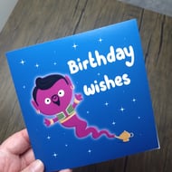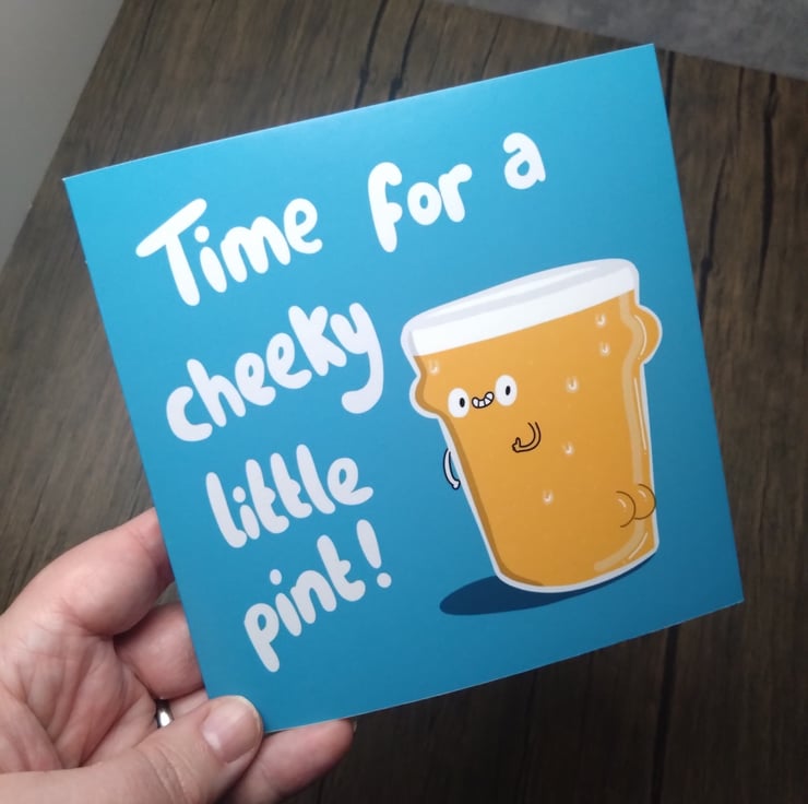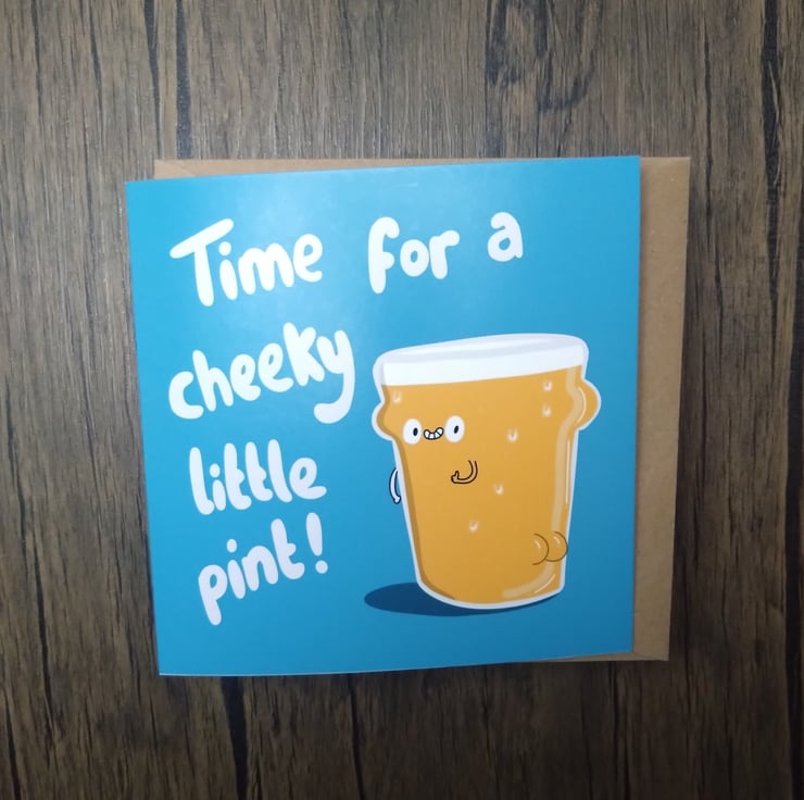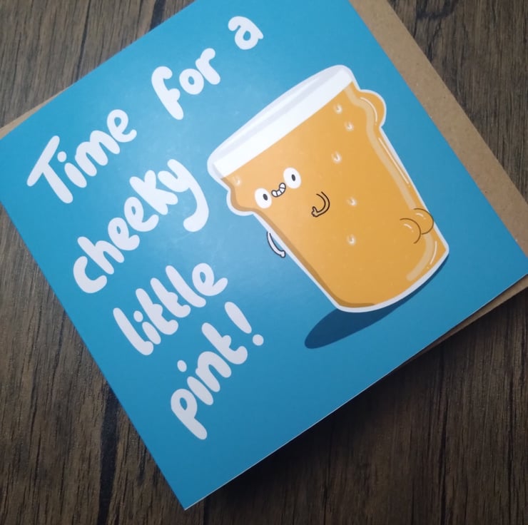 A 6" square birthday card with a pint of lager with a cheeky grin, and a cute little booty. Text reads, time for a cheeky little pint, and has a bright blue background.