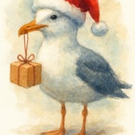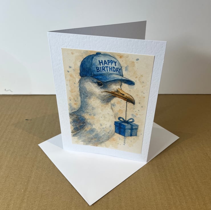 Happy seagull in a blue baseball hat and a little present for you. Hand made. Includes envelope