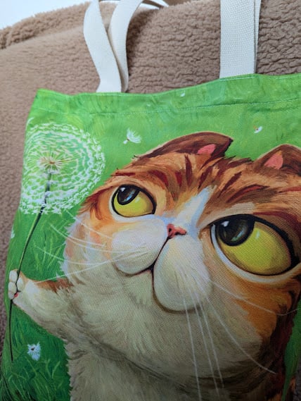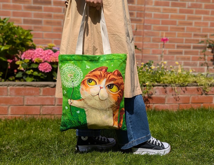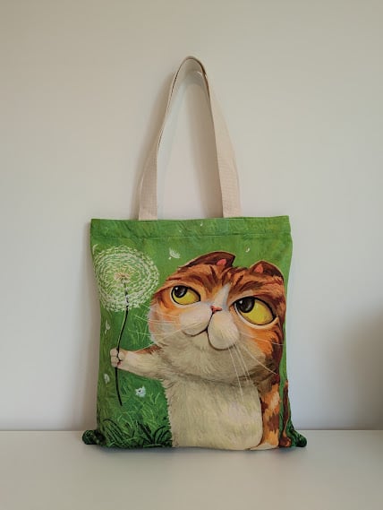 Carry a little piece of sunshine and whimsy with The Wishmaker's Tote. This eye-catching bag features a charming, hand-painted style illustration of a fluffy, orange-and-white cat with strikingly expressive yellow eyes. Set against a lush, vibrant green background of grass, the cat is holding a large, perfectly-formed dandelion puffball, ready to make a wish—or perhaps scatter seeds of joy!