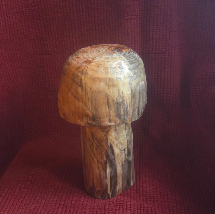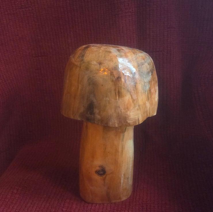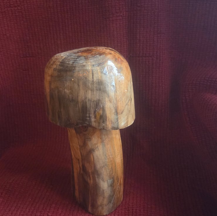 This is a beautiful, hand-carved wooden mushroom, expertly shaped to showcase the rich grain and natural colours of the wood. Standing approximately 25cm tall, this rustic piece makes a powerful statement on any shelf, desk, or mantelpiece. Perfect for adding a touch of woodland magic and natural serenity to your home. It feels weighty and tactile, making it a wonderful object to hold and display.