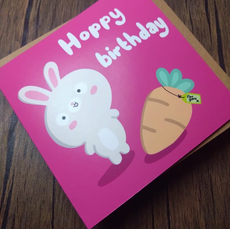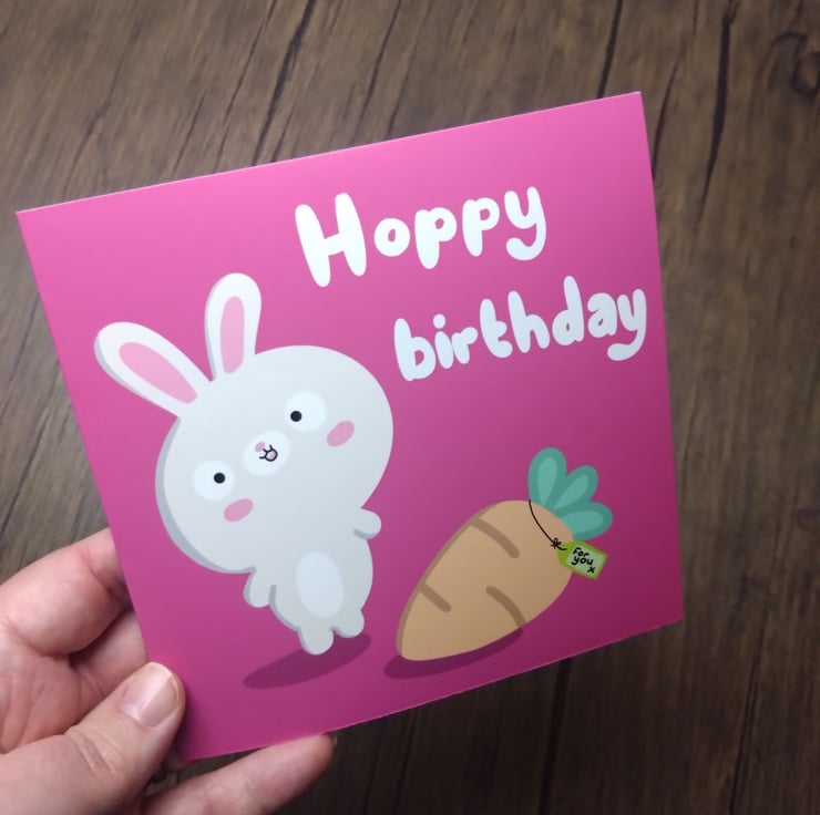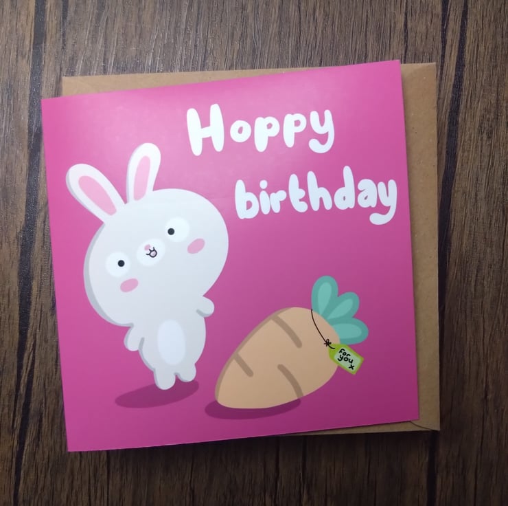 This is a 6" square birthday card with a bunny and a huge carrot gift on a hot pink background. The text reads, hoppy birthday.