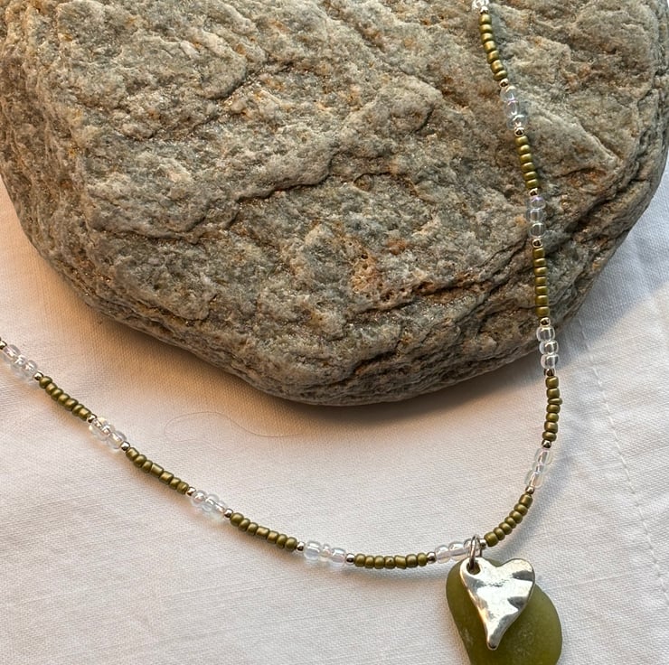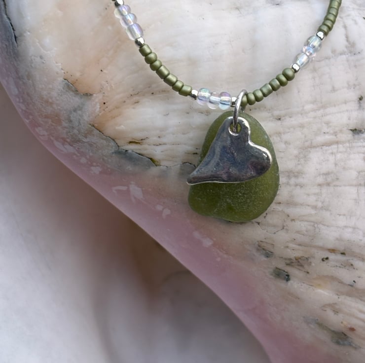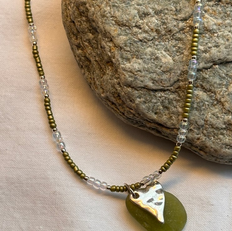 Green seaglass (approx 2.5cm long by 2cm wide) with silver coloured textured metal heart, metallic green, tiny silver and iridescent seed beads reflect colours of the coastline perfectly. On elastic with silver coloured metal lobster clasp and extender chain. Size at a shortest is 37cms and with extender chain 42cms.