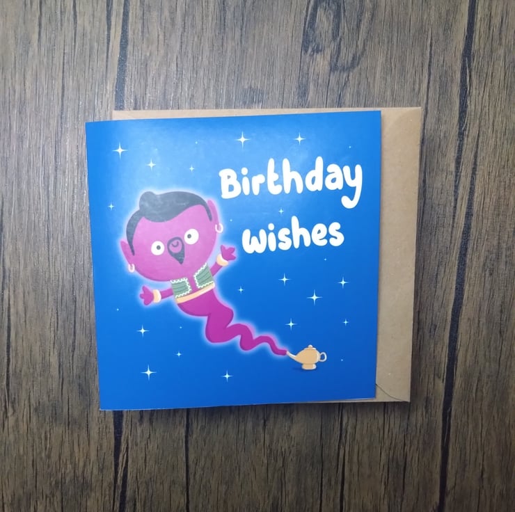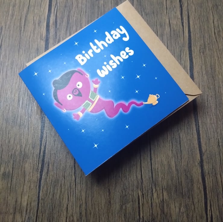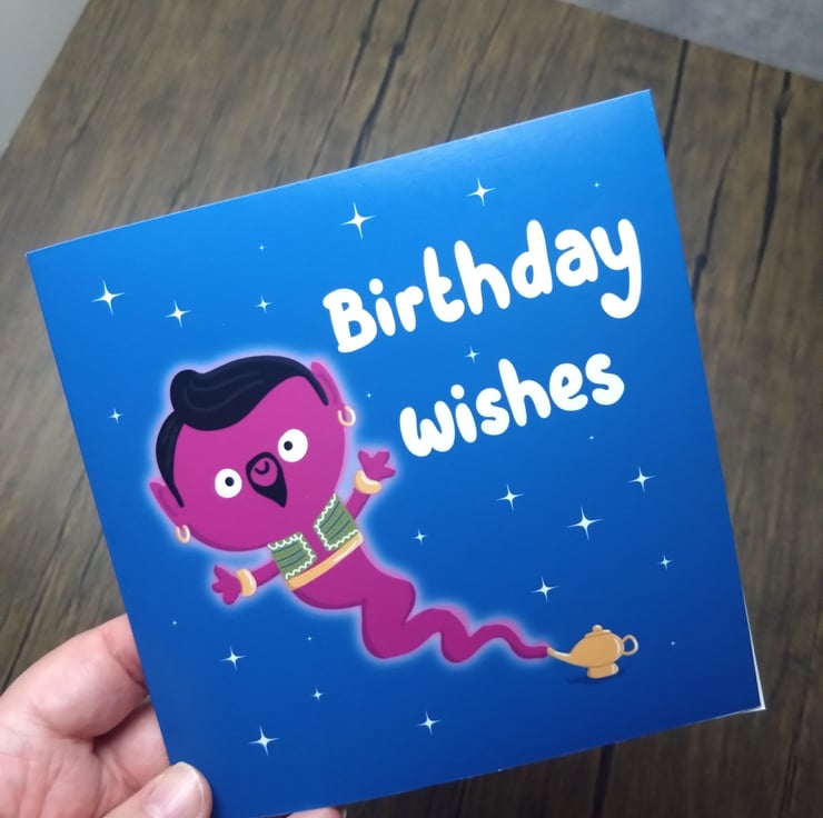 A 6" square birthday card with text that reads, birthday wishes, and features a genie coming out of a lamp.