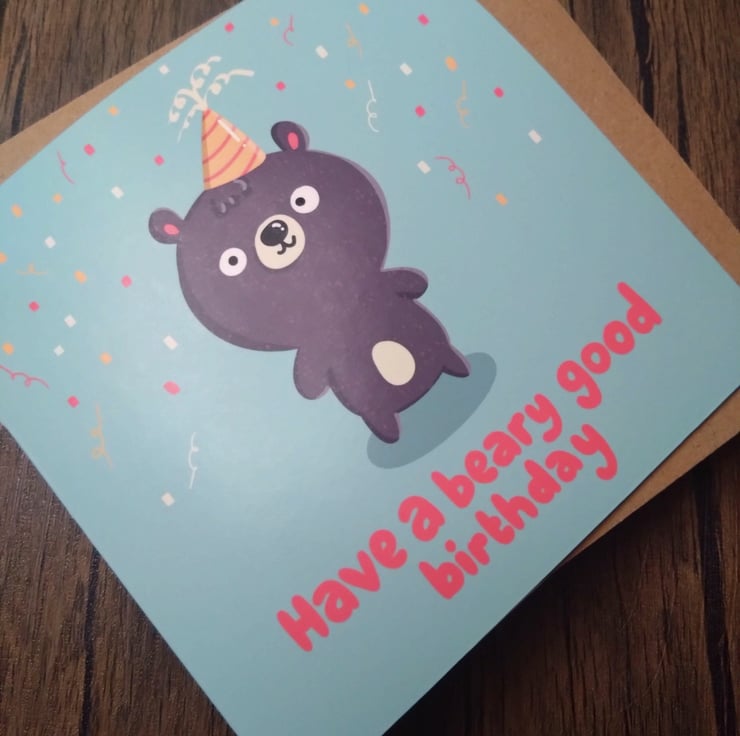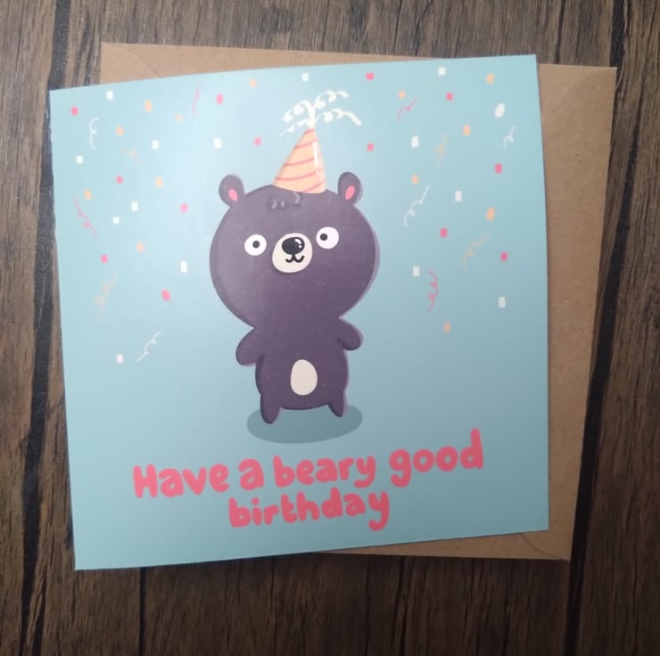 A cute bear celebrating a birthday wearing a party hat, with confetti, and the text reads, have a beary good birthday.