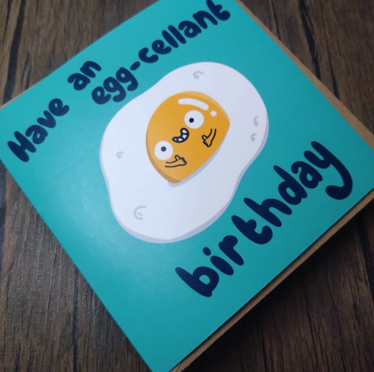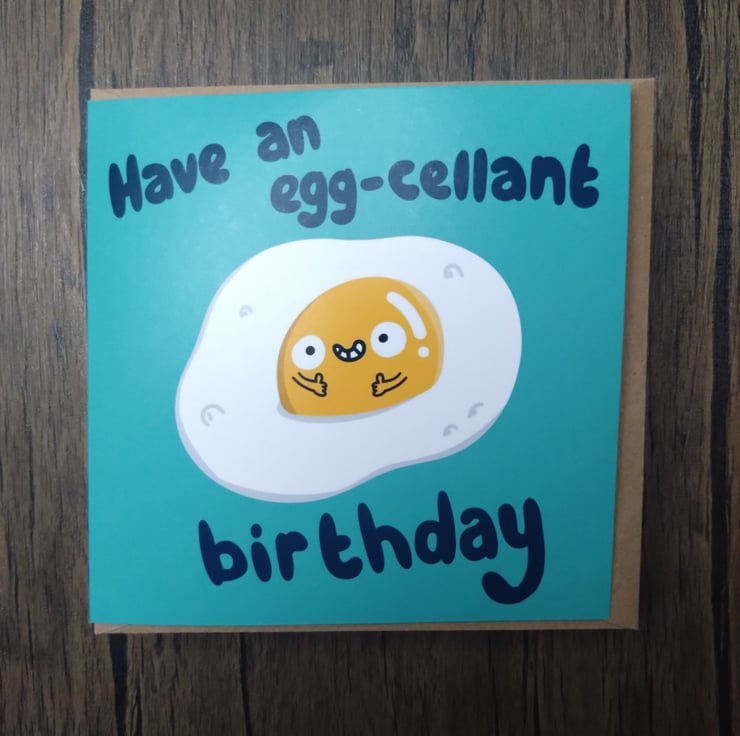 This fried egg is wishing someone an egg-cellent birthday. The card is 6" square, blank inside and comes with a Kraft brown envelope and sealed in a biodegradable cello bag.