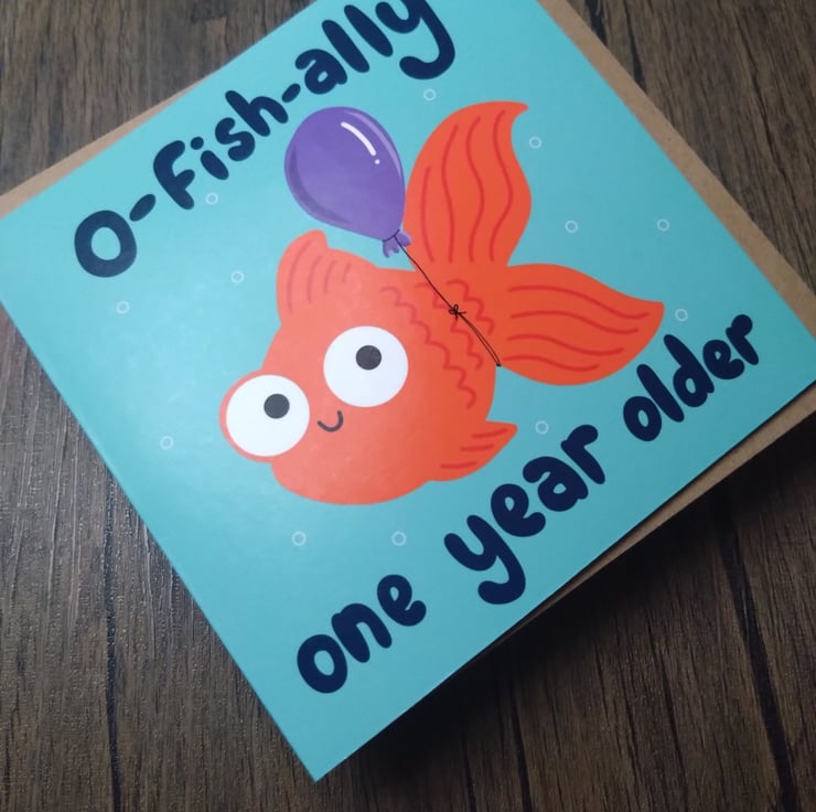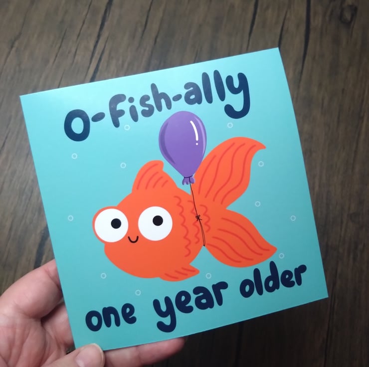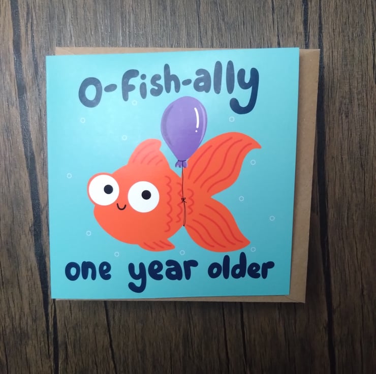 This 6" square birthday card features a goldfish with a balloon and the text reads, o-fish-ally one year older.