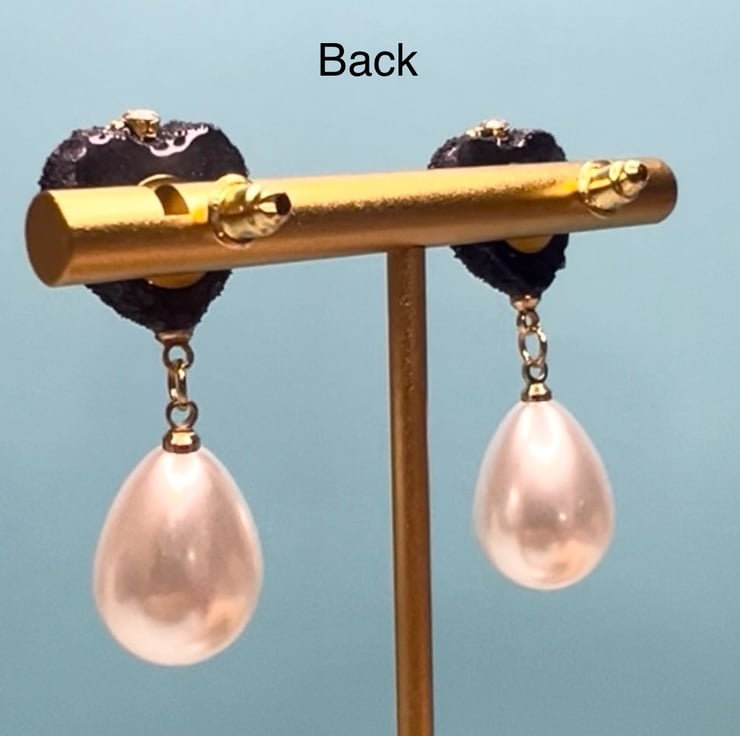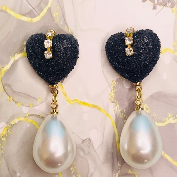 Handmade Black Velvet-like Heart Earrings with Pearl Drops & Rhinestone Accents