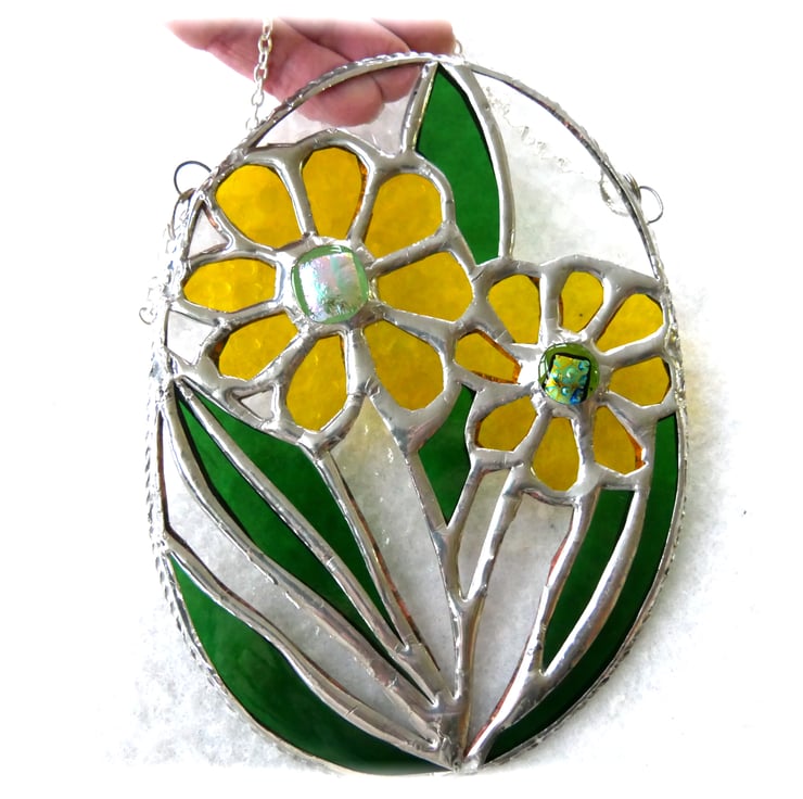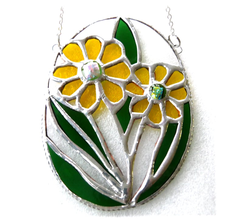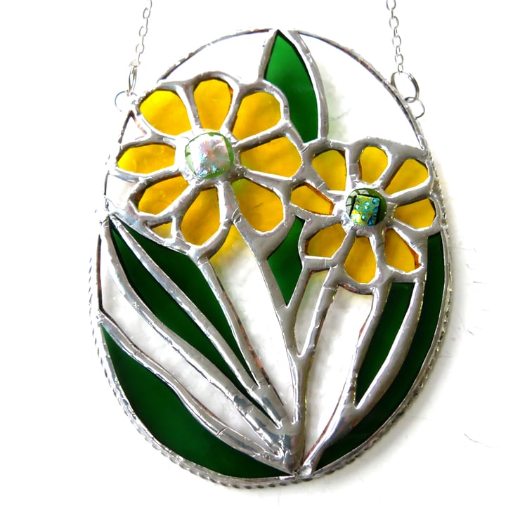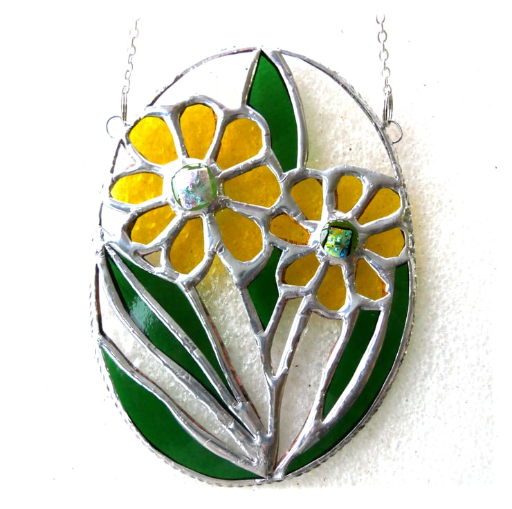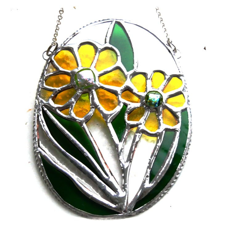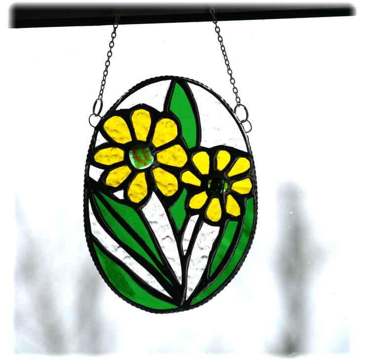 The suncatcher is in the form of an oval picture of two full flowered bright yelow daisies.