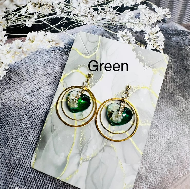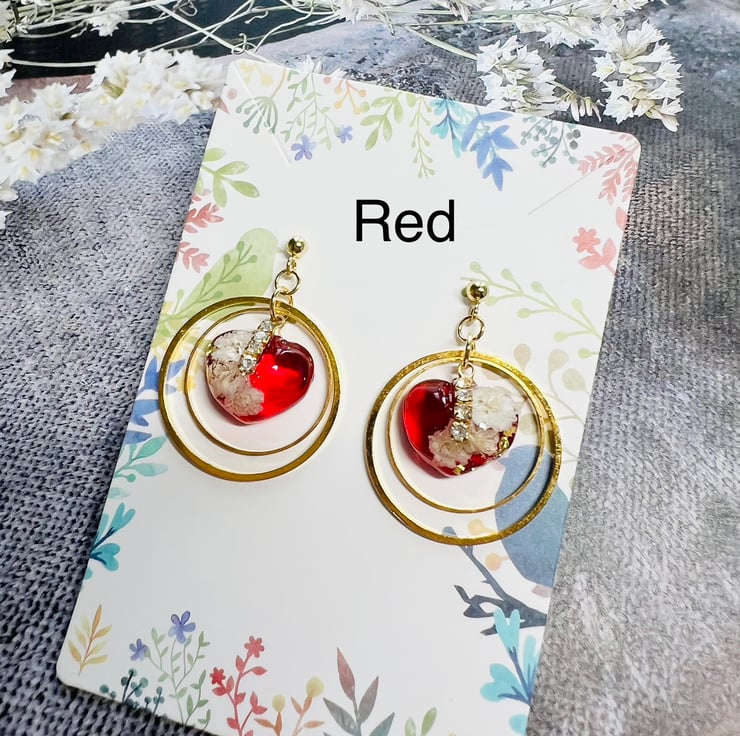 These handmade earrings feature real dried flowers delicately encased in heart-shaped resin, accented with a vertical line of rhinestones. Framed by golden rings, each piece evokes the quiet elegance of nature and the warmth of heartfelt craftsmanship. Available in Pink, Green and Red.