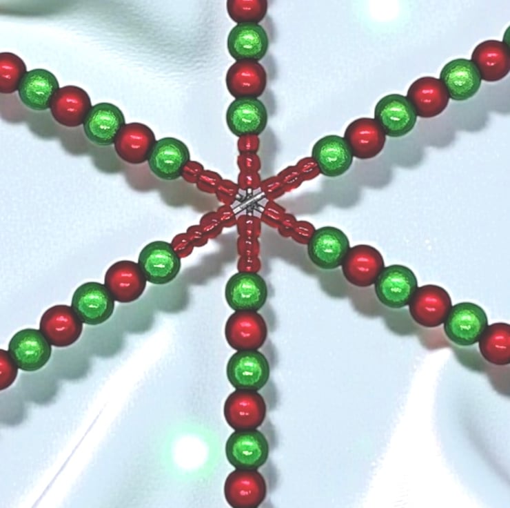 A pretty Christmas snowflake tree decoration, made with red and green acrylic Miracle beads, miracle beads are a bead in a bead and when the light touches them they look like they are lit up, a fab little unusual decoration measuring 4 inches in diameter.