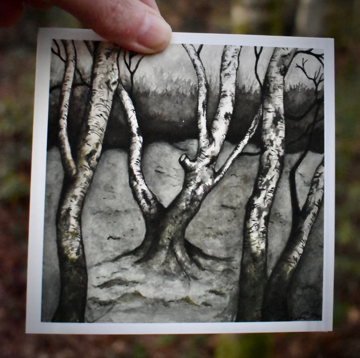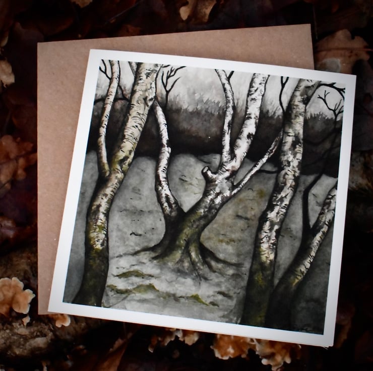 Christmas card, Greeting Card or Notecard for many occasions. Printed on quality paper, this card features a watercolour painting called "Winter Silver Birches". Painted recently, I was first inspired by the silver birches in a local woods, their patterns on the bark and the lush green moss growing along the bottom.