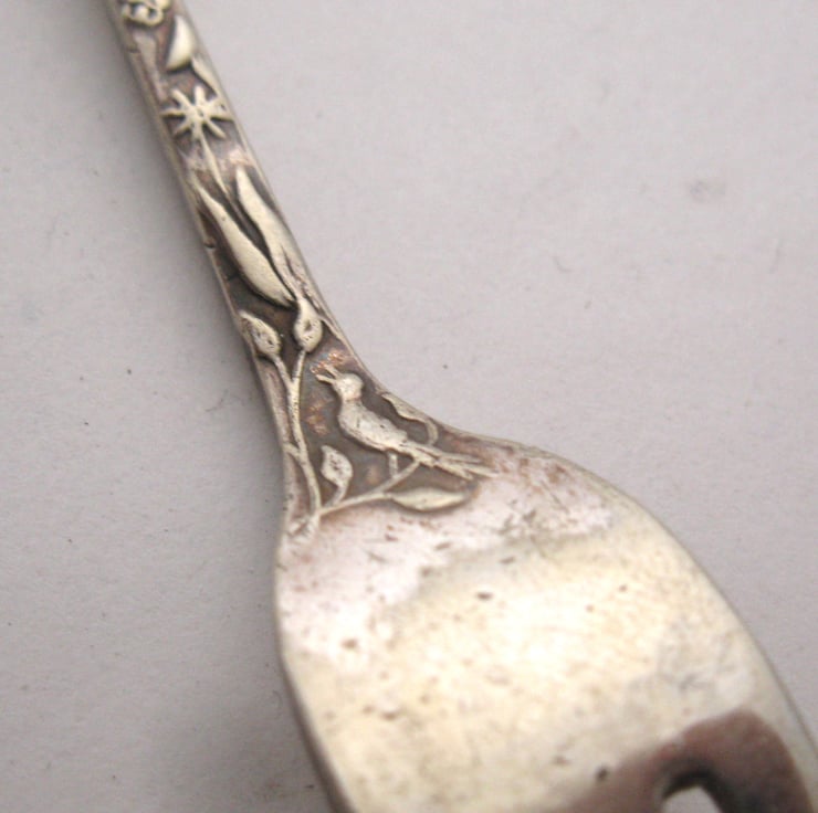 The original decoration on this fork is incredibly detailed, there are birds, butterflies, flowers, leaves, fans... all over the handle and on the back too. It's a generous 19cm long, so it'll reach to the bottom of a substantial jar. I've coloured the lettering black with a non-toxic, water-based acrylic paint. Hand washing will prolong the pigment life and be kinder to the remaining silver plating than a dishwasher. Any tarnish can be easily removed with a drop of silver polish or one of those impregnated silver-cleaning cloths. Avoid leaving the fork standing in acidic liquids such as vinegar pickles, preserved lemons or chutneys, as these can cause pitting and discoloration to the plating and nobody wants a green fork in their food!