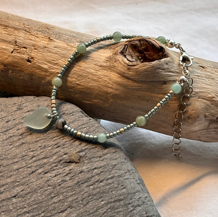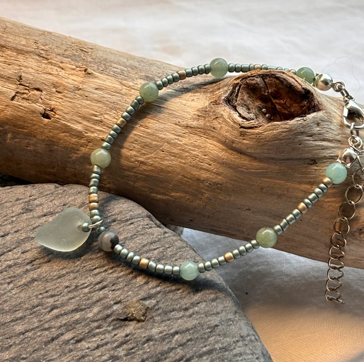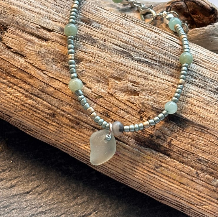 Tiny piece of seaglass carefully hand drilled with metallic seed beads and Amazonite. On waxed thread with silver coloured lobster clasp and extender chain. Length 18-23 cms approx.Seaglass is original as found, not tumbled or shaped and hand drilled.
