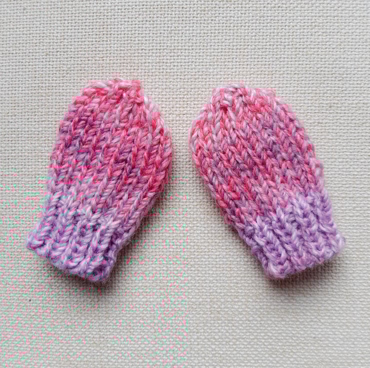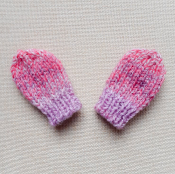 To fit baby: 0-3 (6: 9-12) months. Width across palm: 6 (6.5: 7) cm or 2.25 (2.5: 2.75) inches. The mittens are knitted in chunky yarn using 5 mm and 5.5 mm knitting needles and are knit flat on a pair of single pointed needles or in the round on double pointed needles.