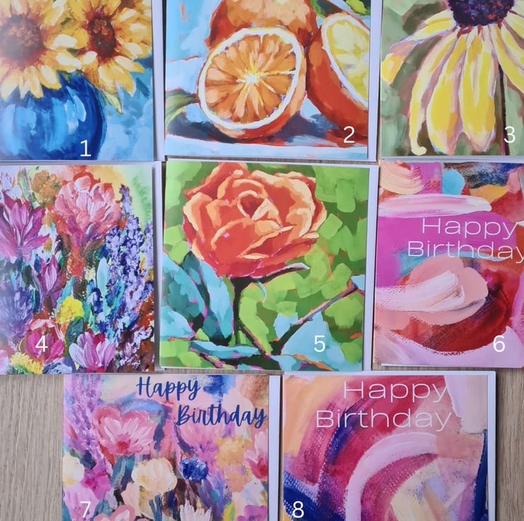 Here is a selection of 8 colourful cards - all with a floral theme. You can choose four cards from the selection for £8. Choose from the drop down menu and if you don't mind what card you get, you can pick the option 'choose for me'.