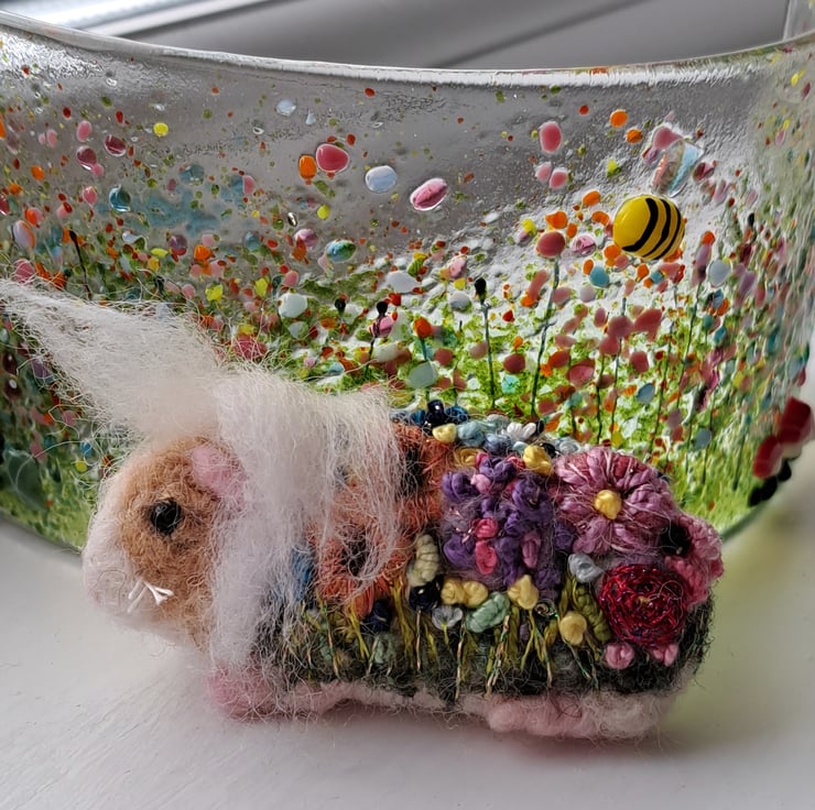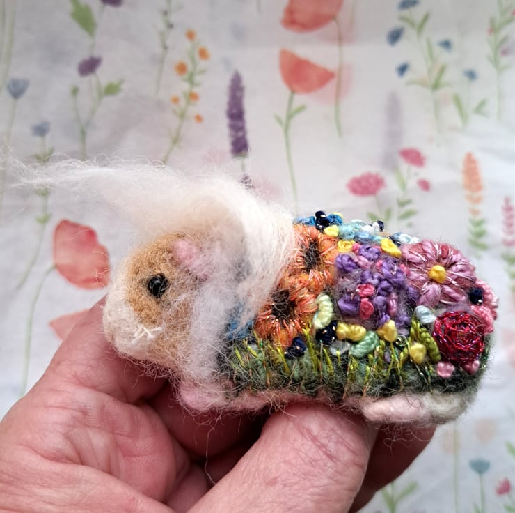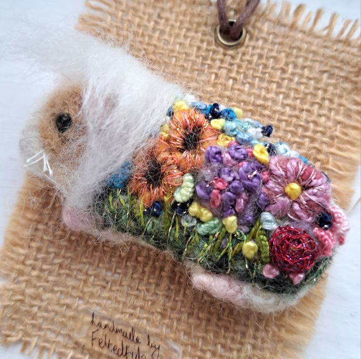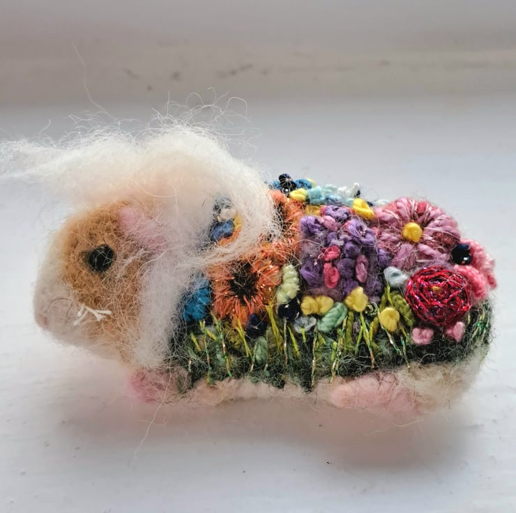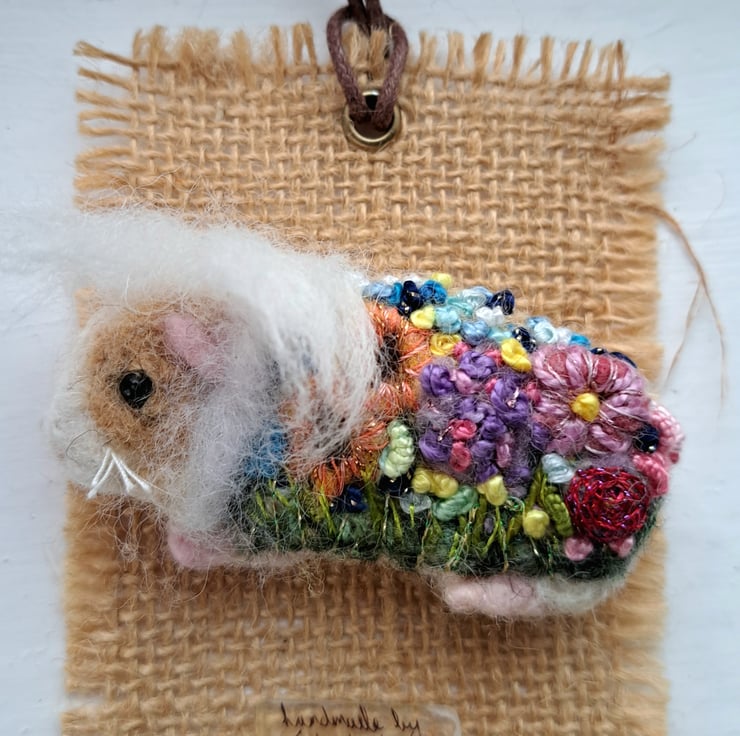 Longhair Guinea pig brooch ,needlefelted and embroidered with metal brooch fitting to rear.Measures approx 3 inch long.