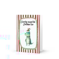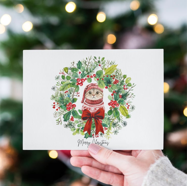 A charming seasonal card showcasing a cat nestled among winter foliage and holiday greenery. The classic wreath is accented with holly, pine cones and a statement red bow, with a clean and timeless Merry Christmas greeting on the front. A purrfect choice for cat lovers or anyone who appreciates cute and cosy festive illustrations.