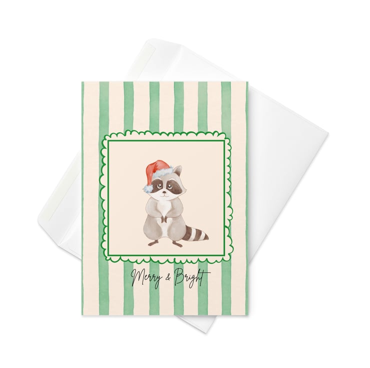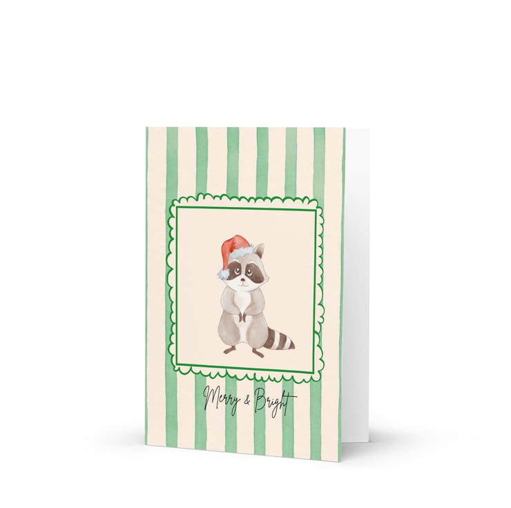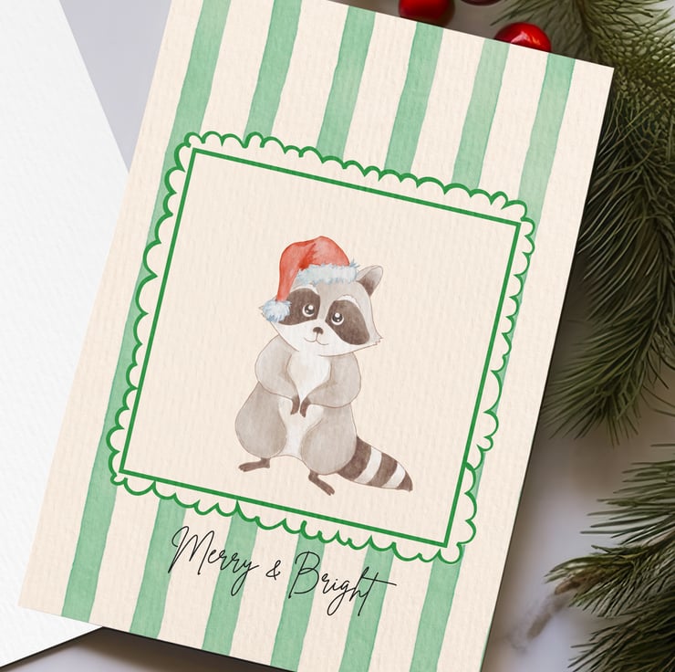 A playful festive card showcasing a mischevious raccoon in a Santa hat, set against pale green stripes with christmas wishes . Suitable for both kids and grown ups who appreciate fun Christmas illustrations.