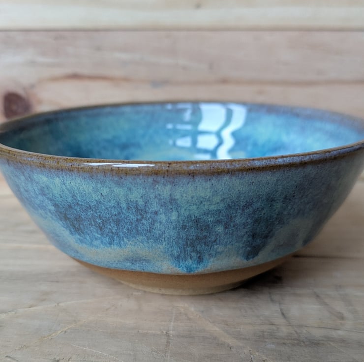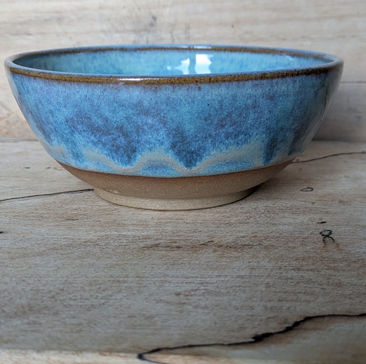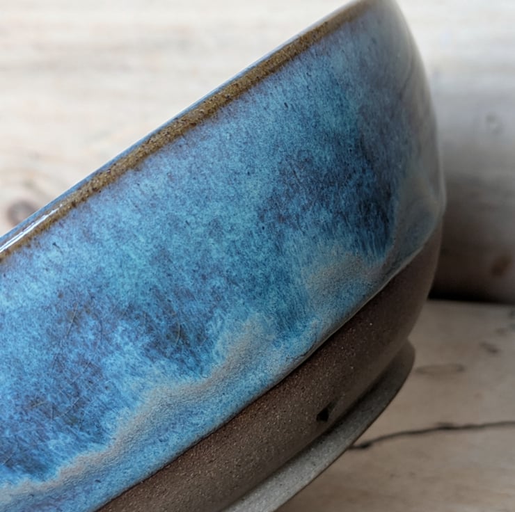 I love this combination of glazes and the way the colours float down from the edge. A little more turquoisey green than the photos show. It's larger than the "nibble" bowls I have listed, just a wee bit bigger for your nibbles, olives, antipasti or whatever you fancy!! I've used a toasted clay and left the bottom edge of the clay exposed on the outside so that you can feel it. The glaze also breaks over a swirl on the base inside. Fired in a kiln at a stoneware temperature (c1200 degrees) which makes it more durable.