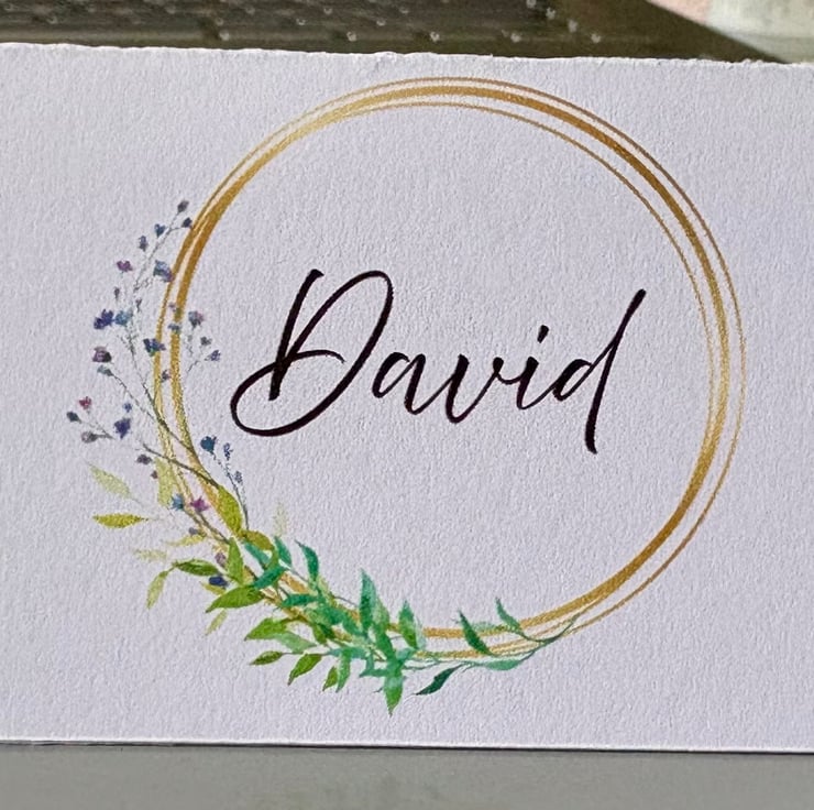 Bring a touch of elegance to your wedding table with these handmade personalised place cards, featuring a modern gold ring design with soft botanical greenery and delicate florals. Each card is professionally printed on high-quality white cardstock and neatly folded, ready to place straight onto your tables.