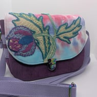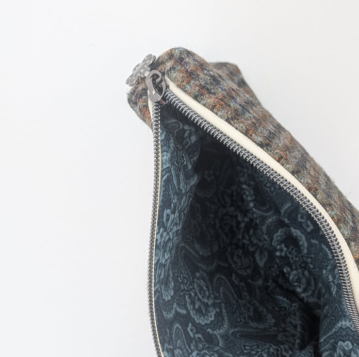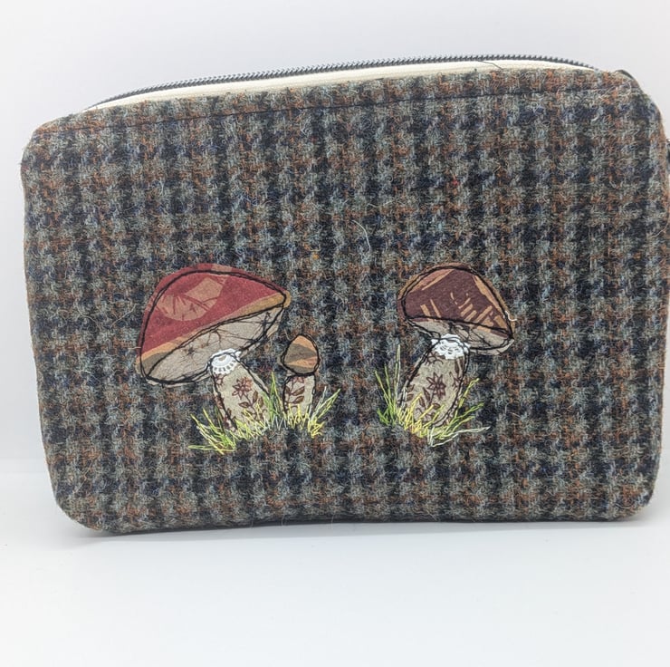A brown vintage tweed pouch with boxed corners, making a handy storage bag. A cute little toadstool applique in sari silk on the front. Lined with a vintage blue/green floral fabric.