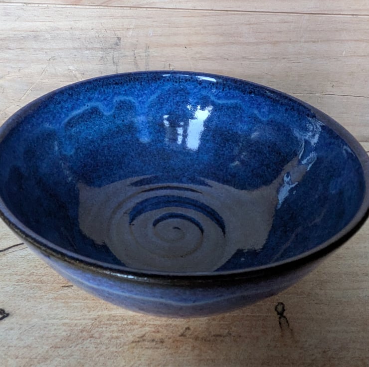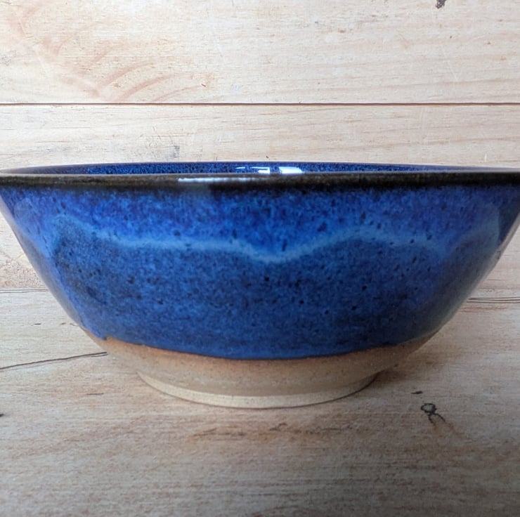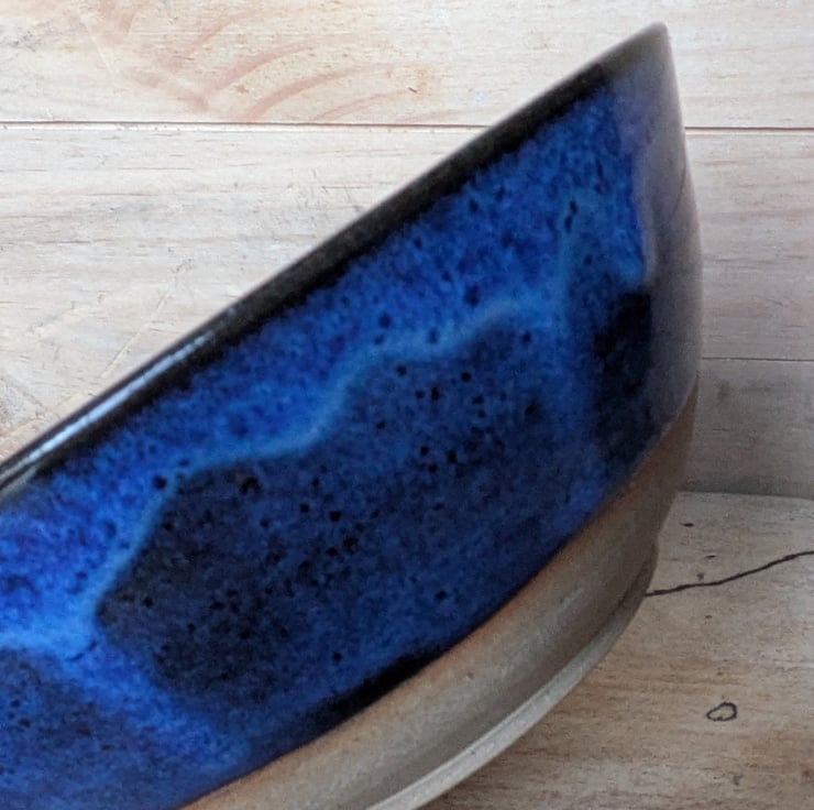 I love this combination of glazes. This is a mid-sized bowl & has come out a little darker than some of the others in the same glaze. I've used a buff clay and left the bottom edge of the clay exposed on the outside so that you can feel the texture. The glaze also breaks over a swirl on the base inside. Fired in a kiln at a stoneware temperature (c1200 degrees) which makes them more durable.