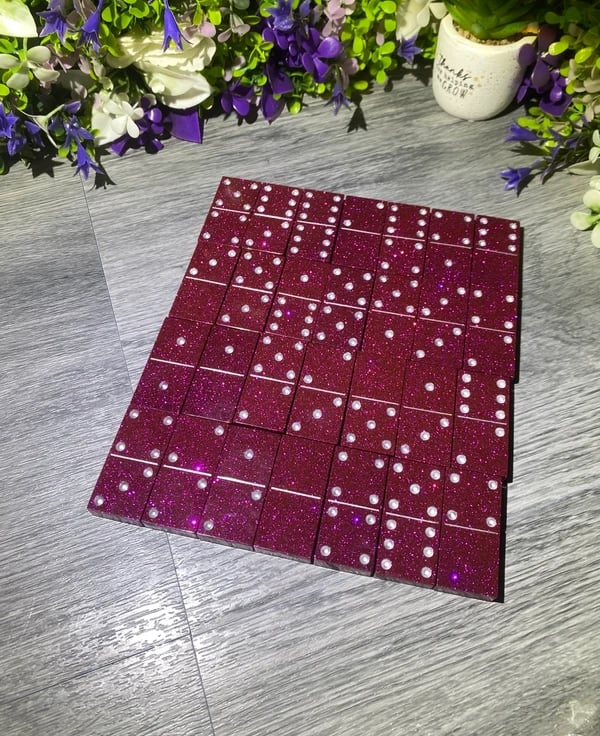 A handmade set of dominoes in purple glitter and silver pips. Standard size, perfect for games night! Each piece is unique and comes gift-wrapped, perfect for gifting or treating yourself. includes box