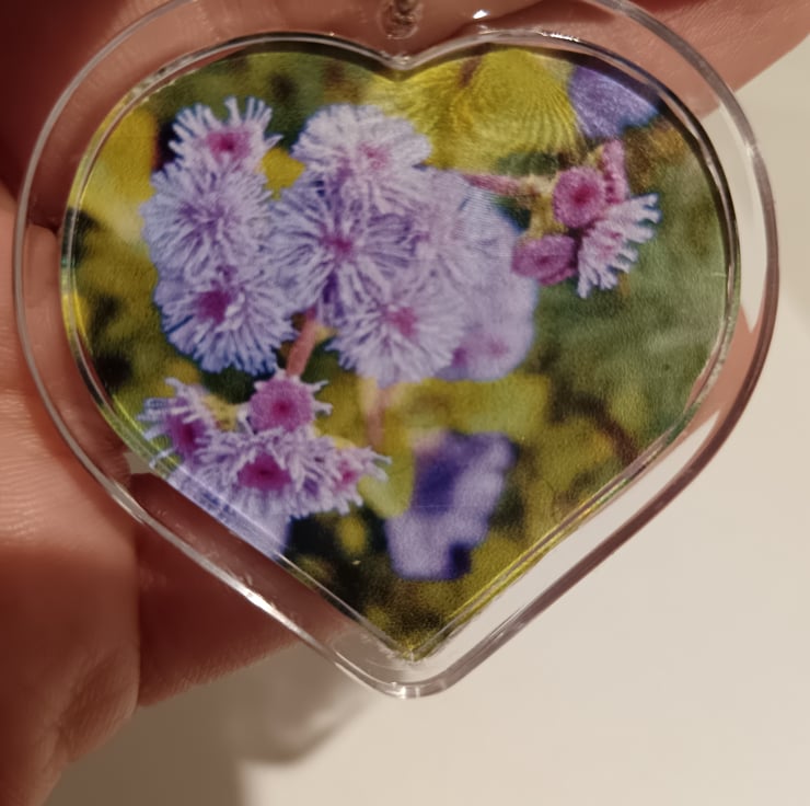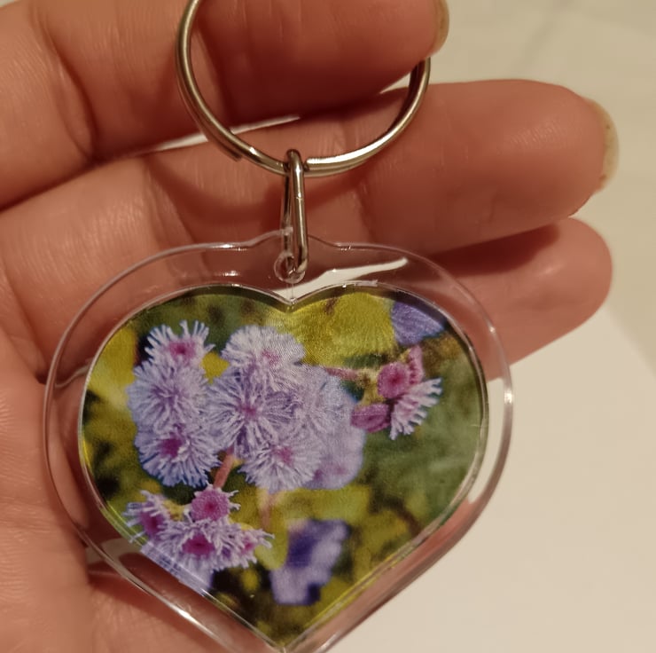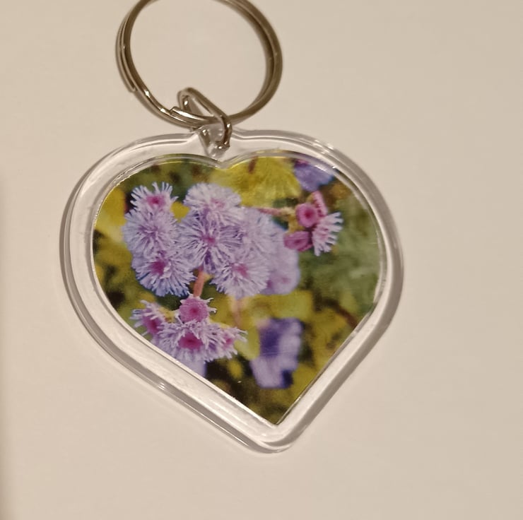 Beautiful heart shaped keyring featuring Ageratum Houstonianum flowers also known as flossflower, bluemink, goatweed, blueweed, pussy foot or Mexican paintbrush.