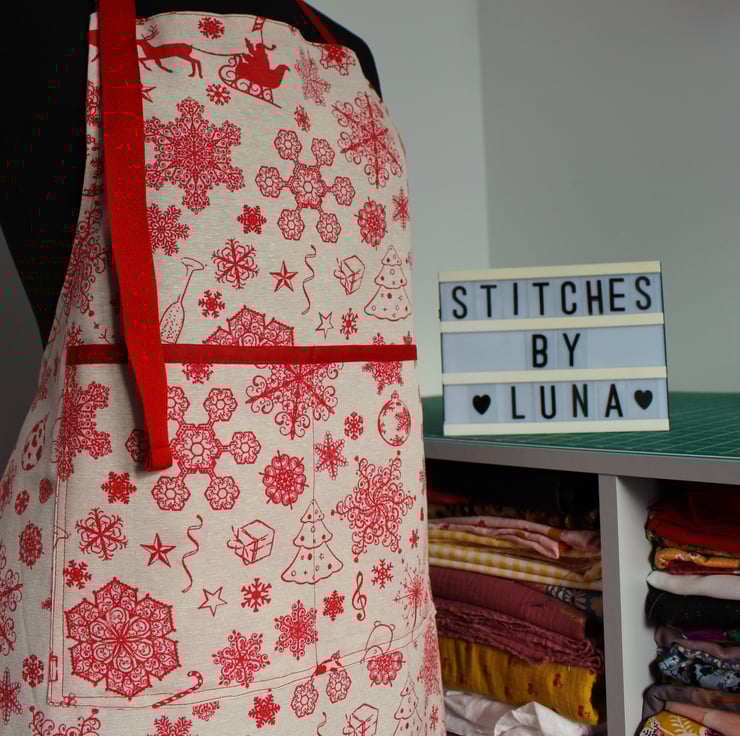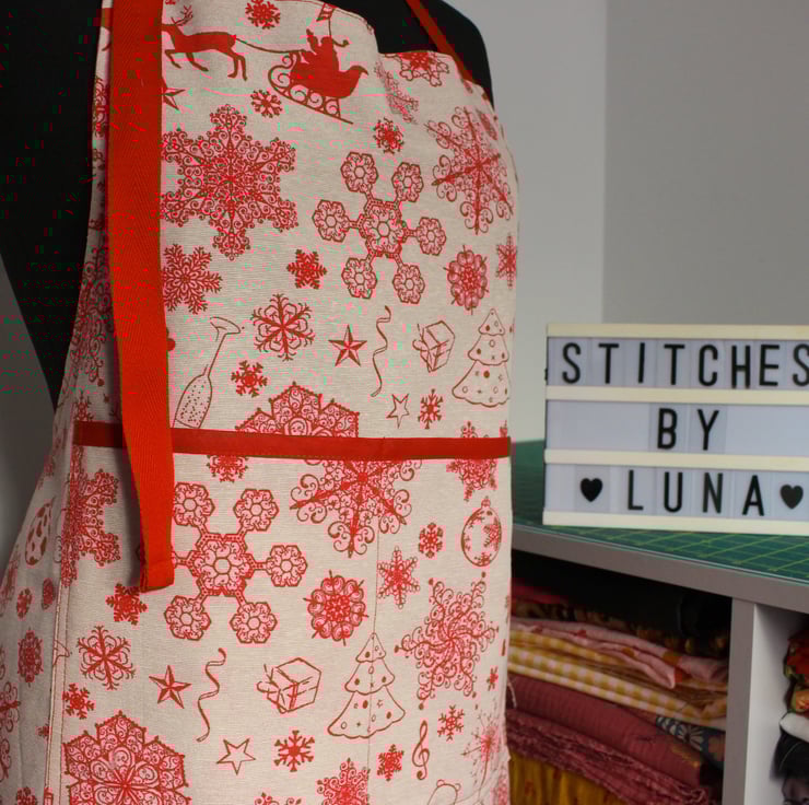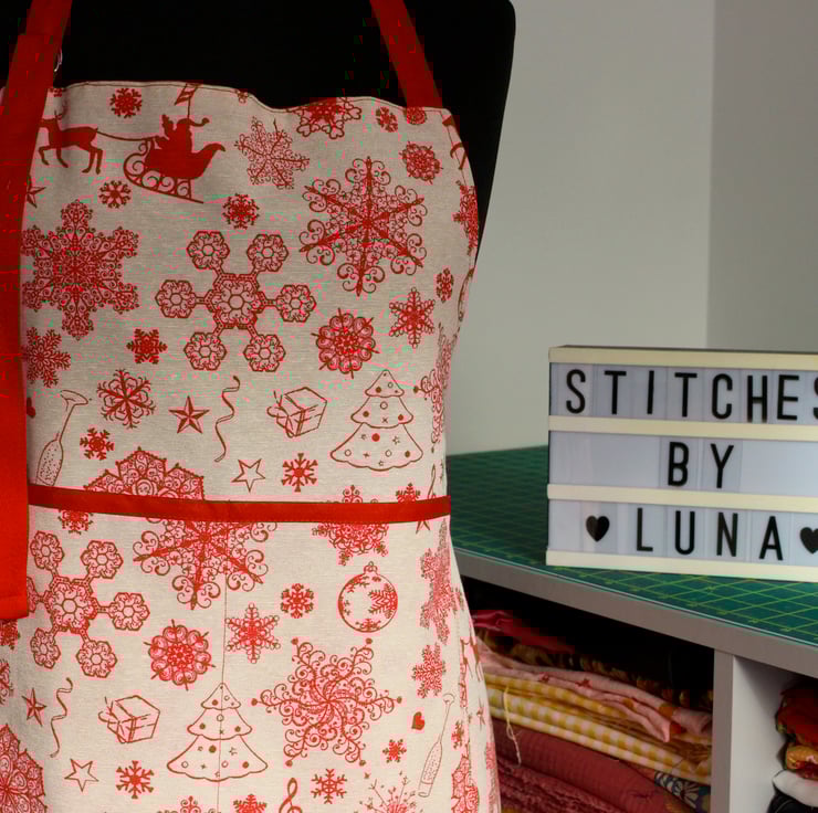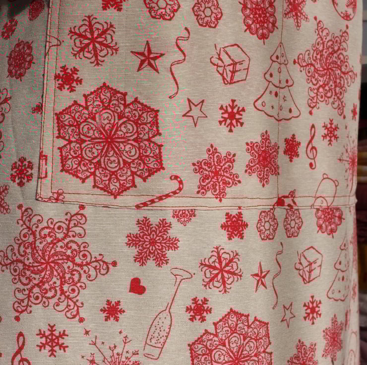 Add festive cheer to your holiday baking and crafting with this beautifully handcrafted Christmas apron! Made from durable cotton canvas and fully lined for comfort, it features charming red holiday motifs including snowflakes, trees, stars, and seasonal icons
