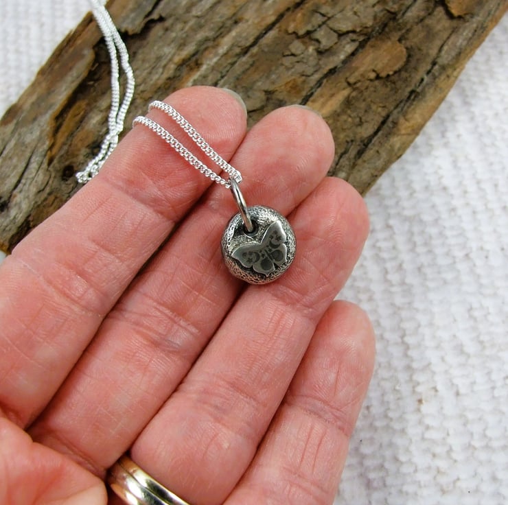 I have made the pebble shape by heating sterling silver to melting point where it forms a natural pebble shape. Once cooled I have soldered on a small butterfly shape and a bail. Once this was done I etched a pattern I designed with tiny moon and stars into the butterfly wings with a laser tool. Fitted to an 18 inch .925 Sterling Silver Chain.
