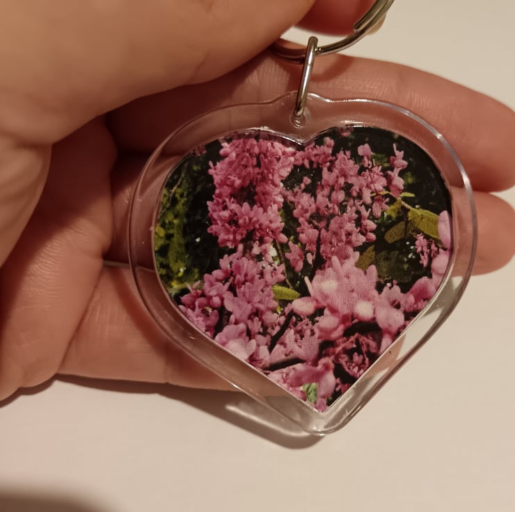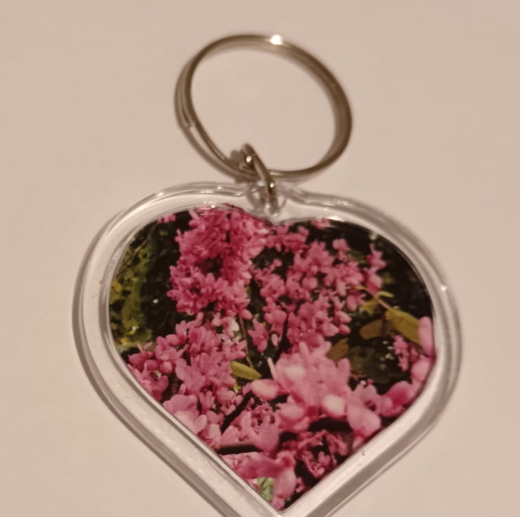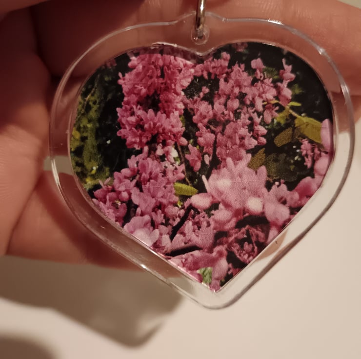 Heart shaped keyring featuring some pretty pink flower blooms coming off a tree. Photography taken by myself. Opposite side is blank.