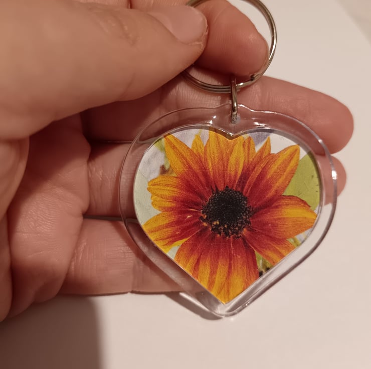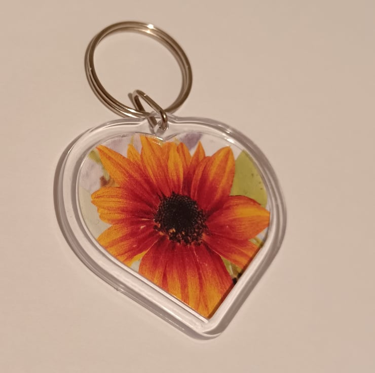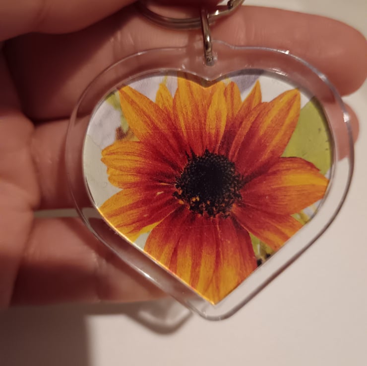 Bright yellow and orange sunflower within a heart shaped keyring. Photography taken by myself. Opposite side is blank.
