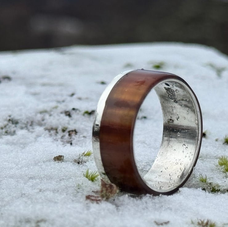 Working by hand in my workshop, I set each piece of ethically sourced Highland cow horn into a wide sterling silver band, polishing it until the unique grain and colour come alive. No two pieces ever look the same, and that individuality is exactly what inspired the design: jewellery that feels grounded, organic, and deeply connected to the landscape it comes from.