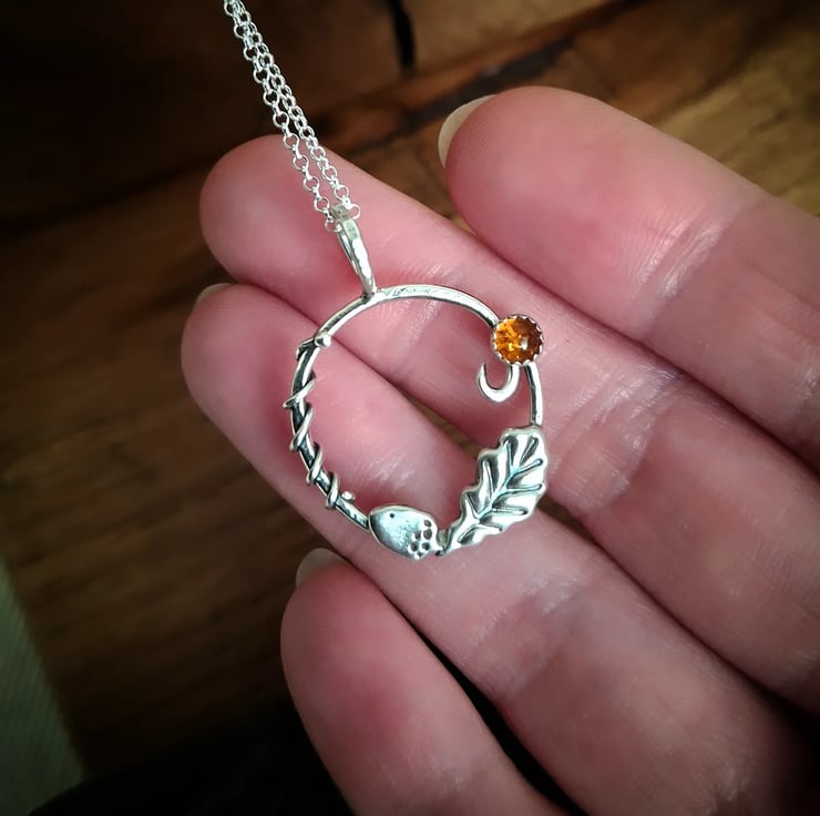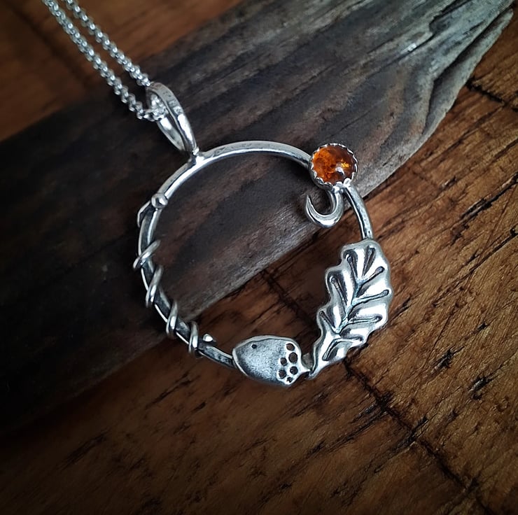 This oak leaf and acorn wreath pendant has a beautiful flowing dynamic with the wreaths symbolic meaning of continuity (circle of life) and the oak & acorn expressing the strength and stability we need to keep going. Amber adds a touch of warmth & light to keep it all in balance.