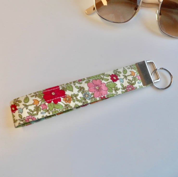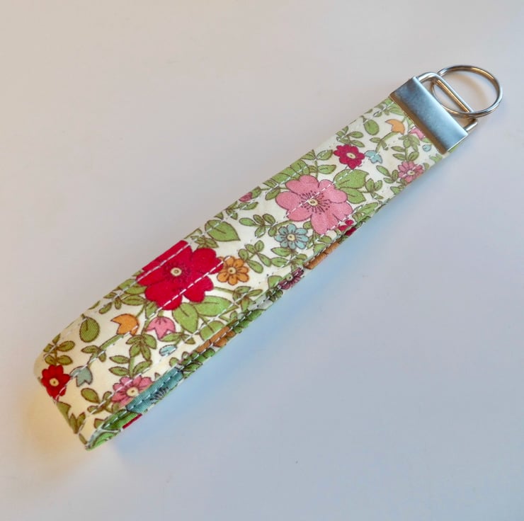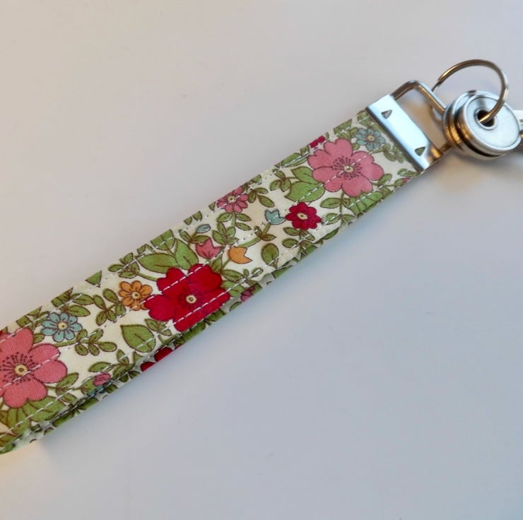 This wrist strap key ring is made using a gorgeous Rose and Hubble fabric with a modern floral print of pink flowers and green leaves on a creamy background. I interlined it to give it body and strength. Top stitched at the edges and down the centre with ivory colour thread.