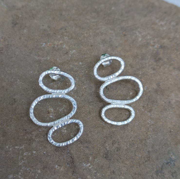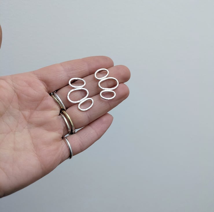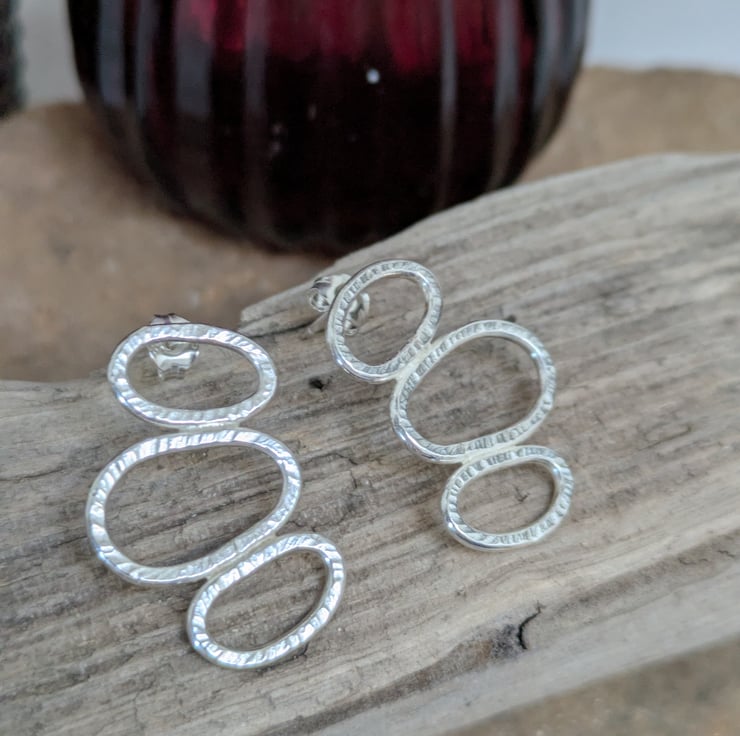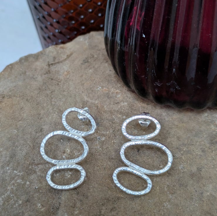 Solid 925 sterling earrings handmade in Sheffield from recycled silver. The ovals curve round to frame your face, and the hammered texture catches the light for a bit of sparkle.