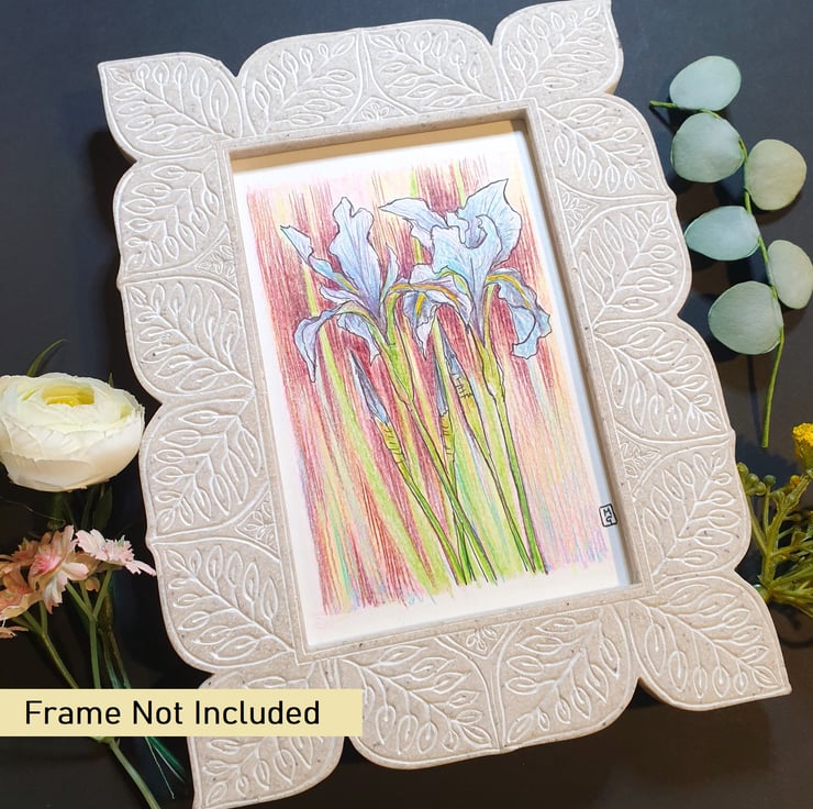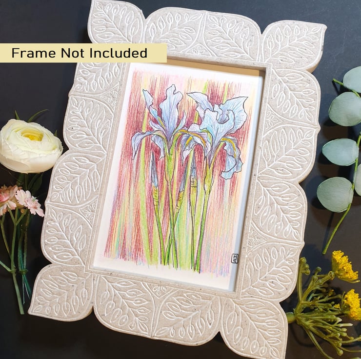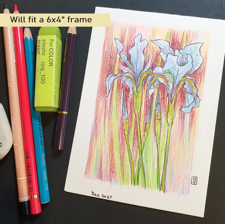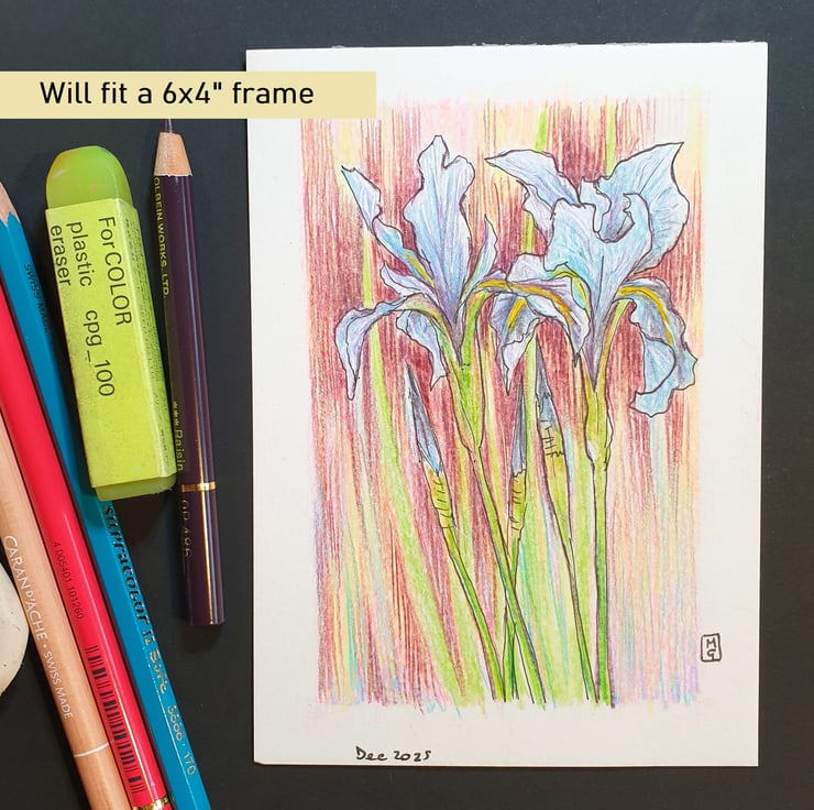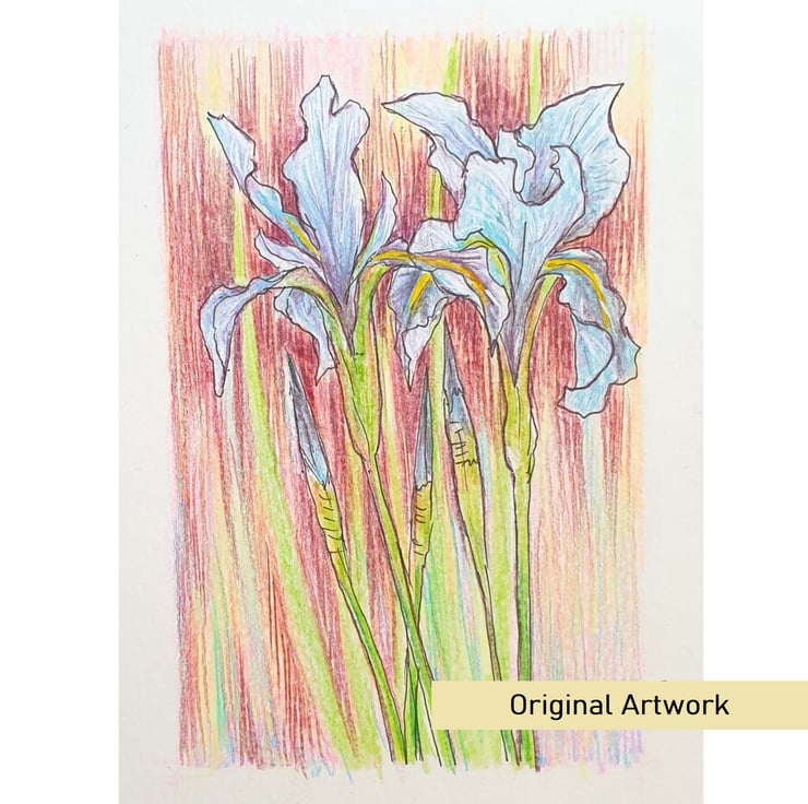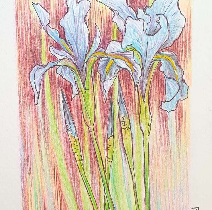 A very small drawing in colour pencil and pen and ink of blue iris flowers with a multi colour background.