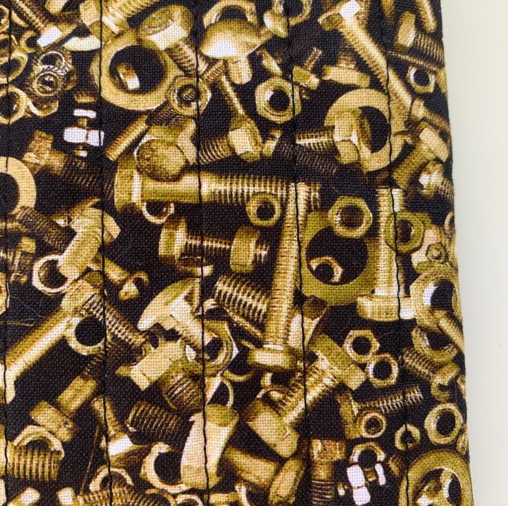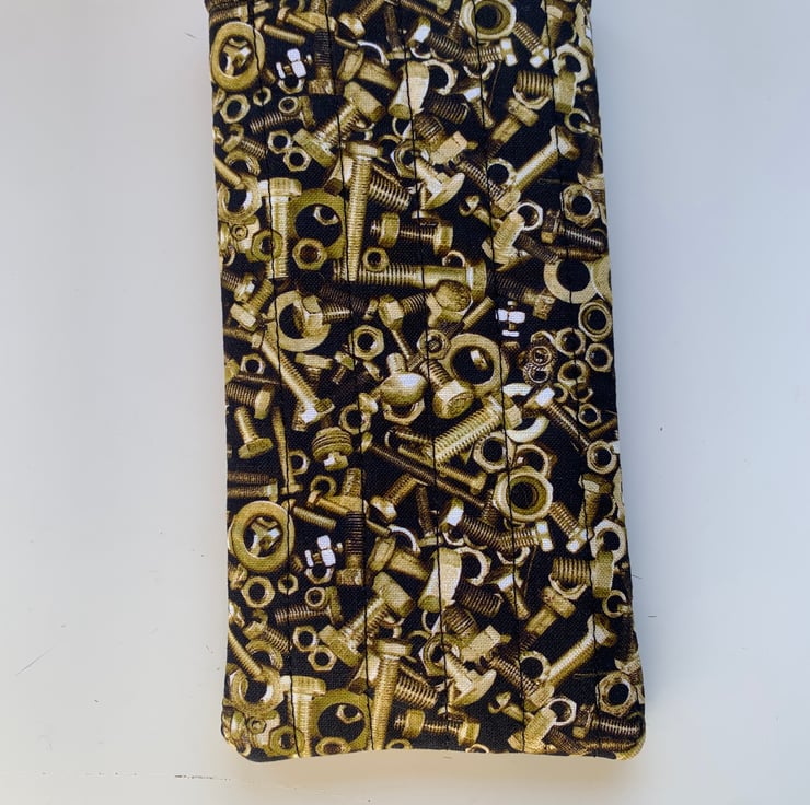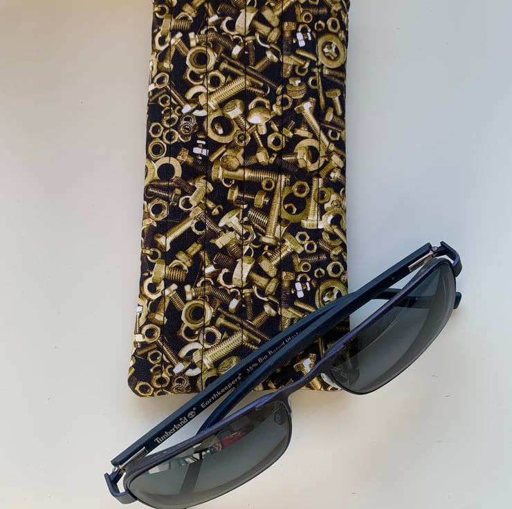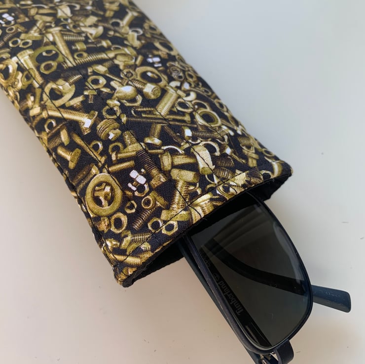 The padded slip in style glasses/sunglasses case is made in this striking nuts and bolts design print fabric.