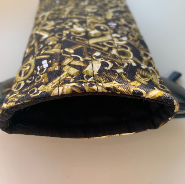 The case is quilted with black thread and is fully lined in plain black cotton.